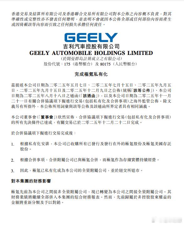 懂车之道讯 懂车之道快讯,吉利汽车控股有限公司在港交所公告:公司已收购所有已发行及发行在外的极氪股份及极氪美国存托股份。根据合并事项,合并附属公司已与极氪合并,而极氪作为存续实体持续经营。因此,极氪已私有化成为吉利的全资附属公司,并于纽交所退市。