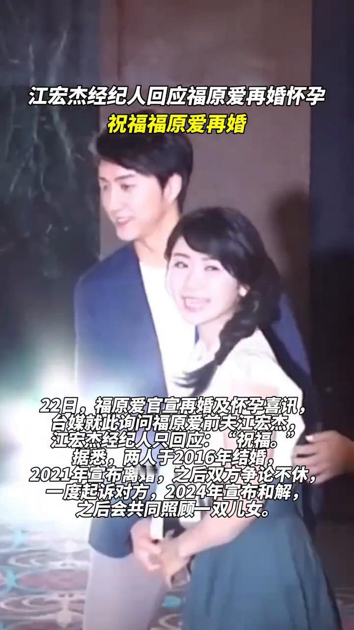 江宏杰经纪人回应福原爱再婚怀孕,祝福福原爱再婚。 22日,福原爱官宣再婚及怀孕喜讯,台媒就此询问福原爱前夫江宏杰,江宏杰经纪人只回应:"祝福。据悉,两人于2016年结婚,2021年宣布离婚,之后双方争论不休,一度起诉对方,2024年宣布和解,之后会共同照顾一双儿女。"