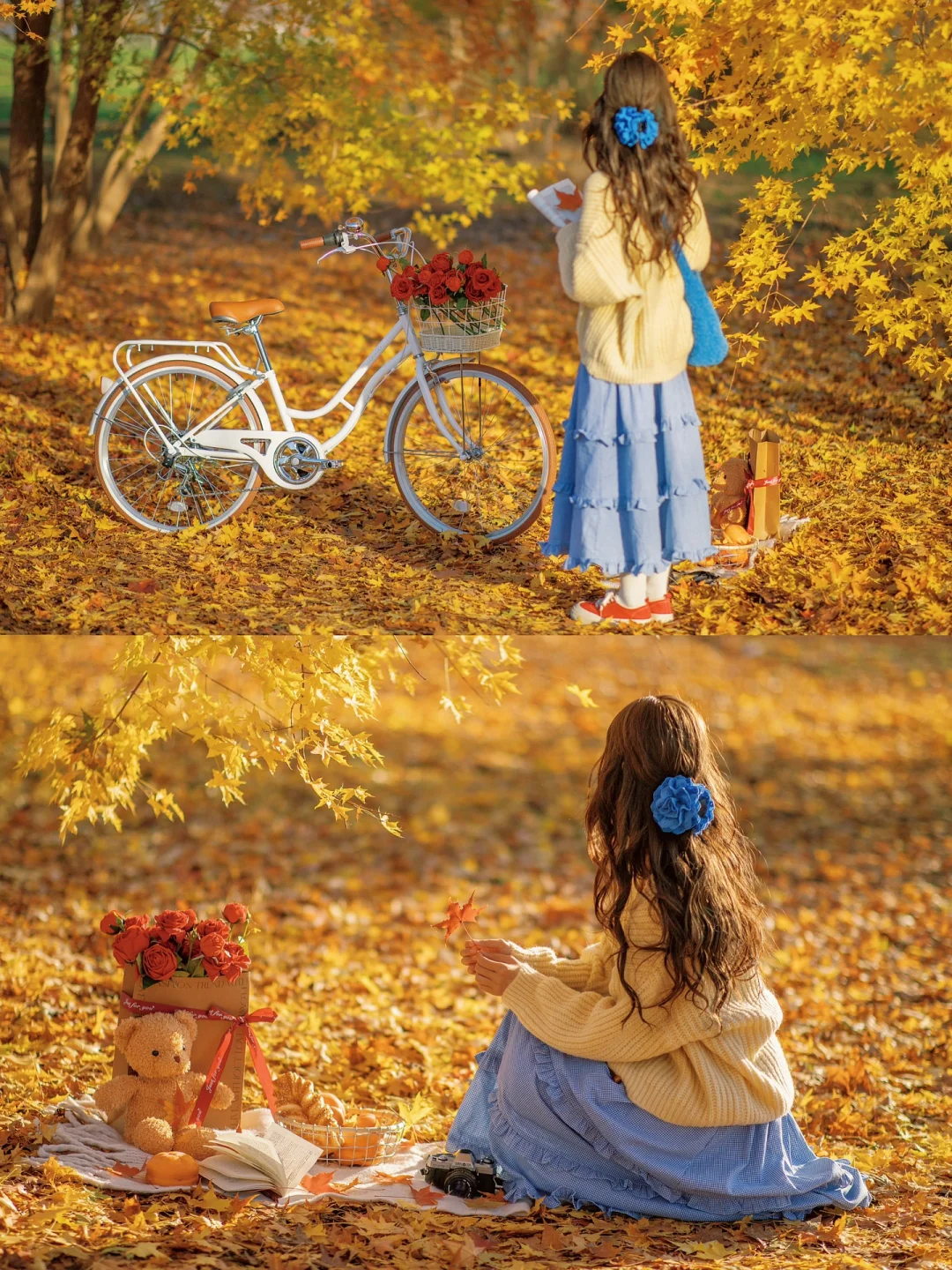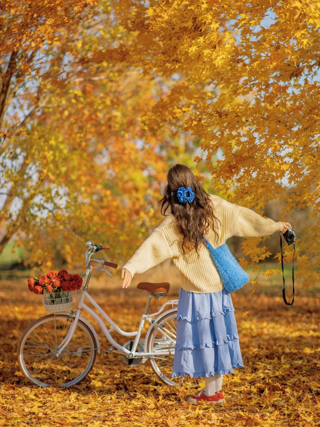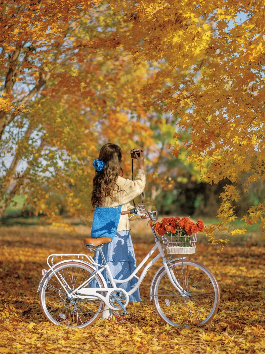 秋天公园落叶电影感拍照|骑进金黄色的秋天