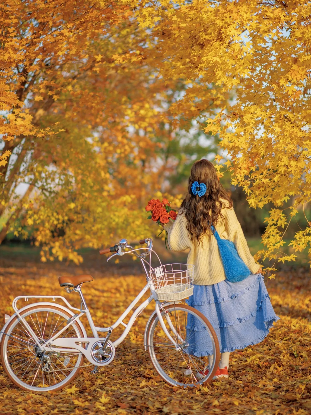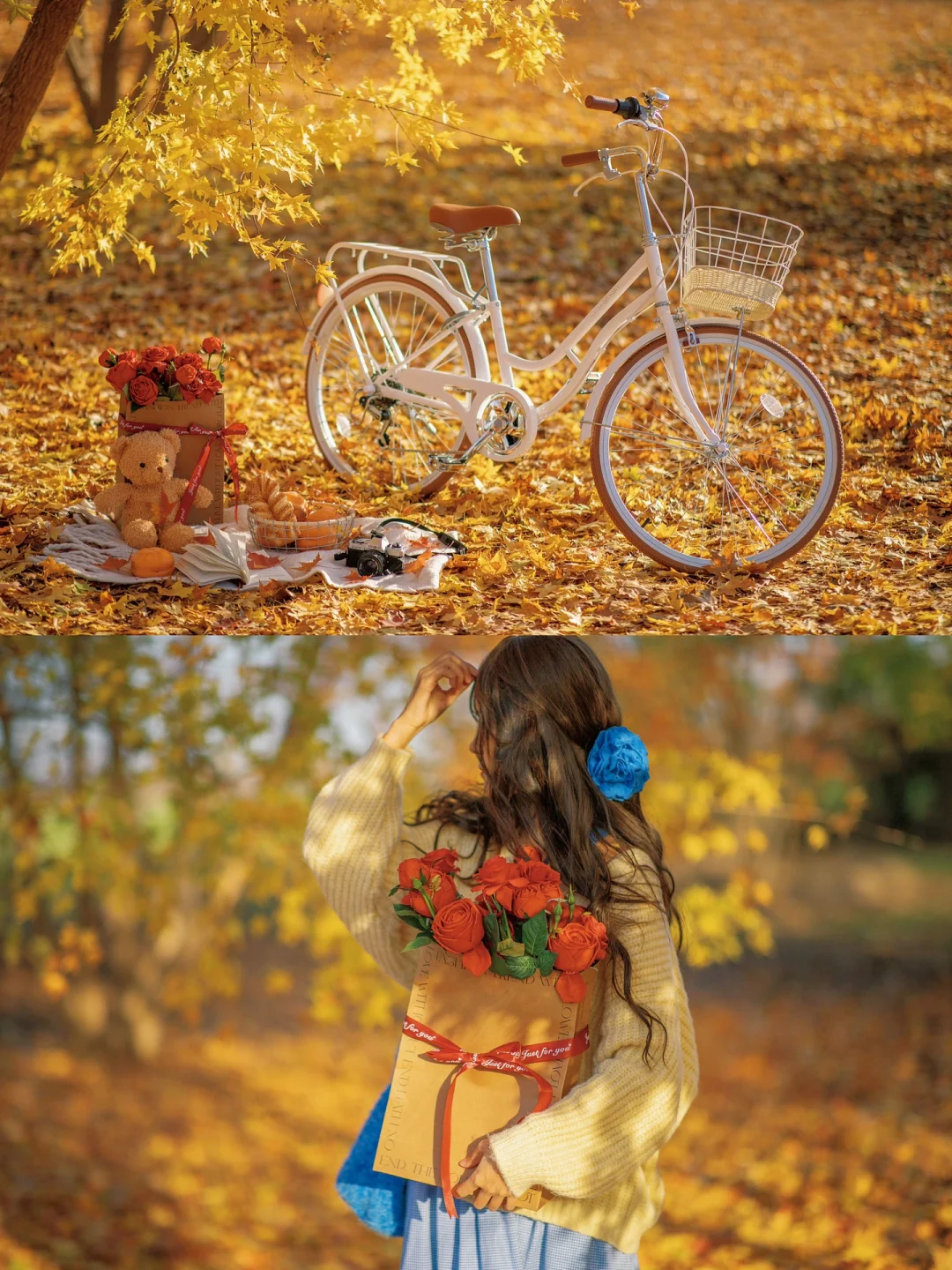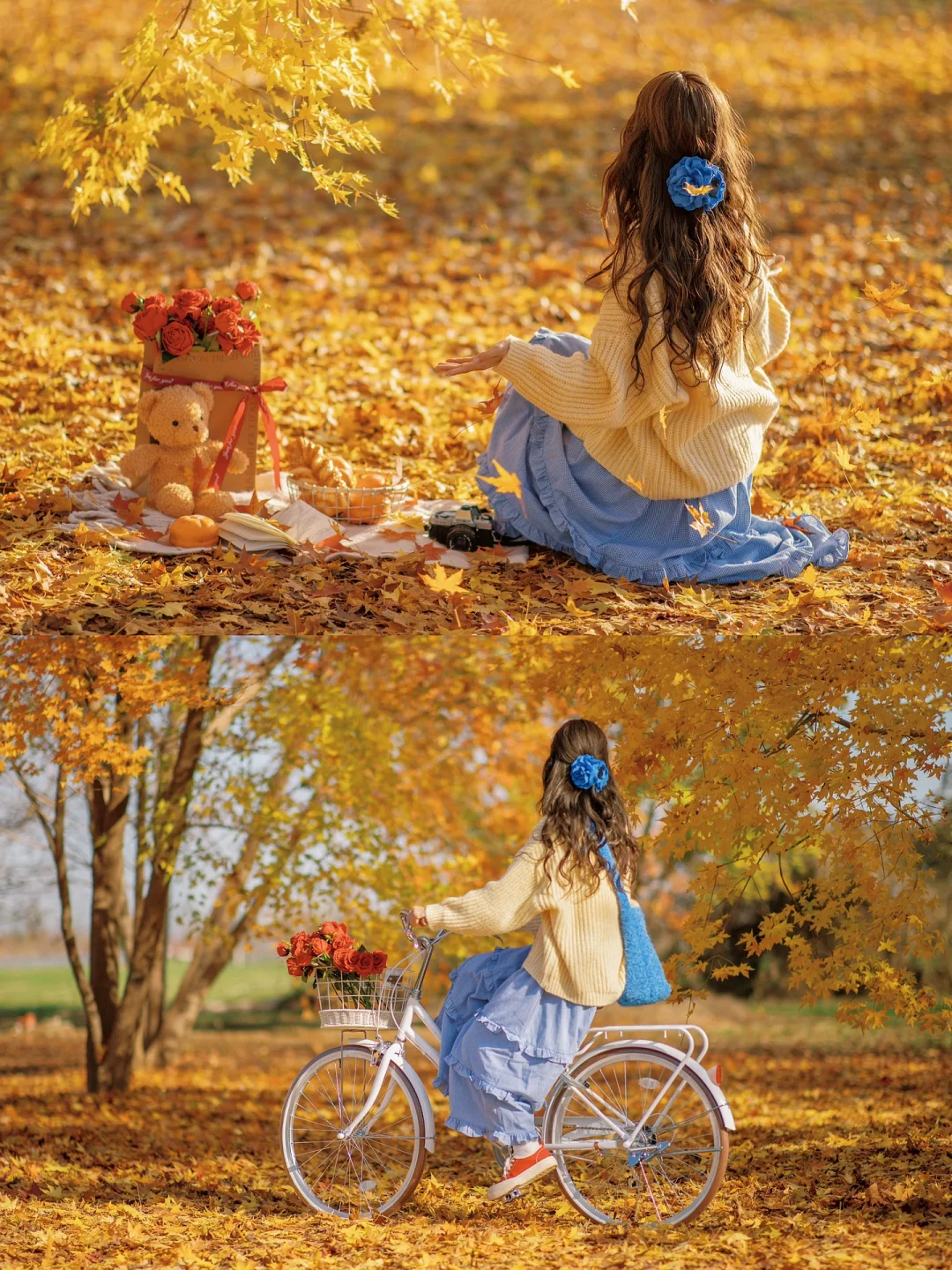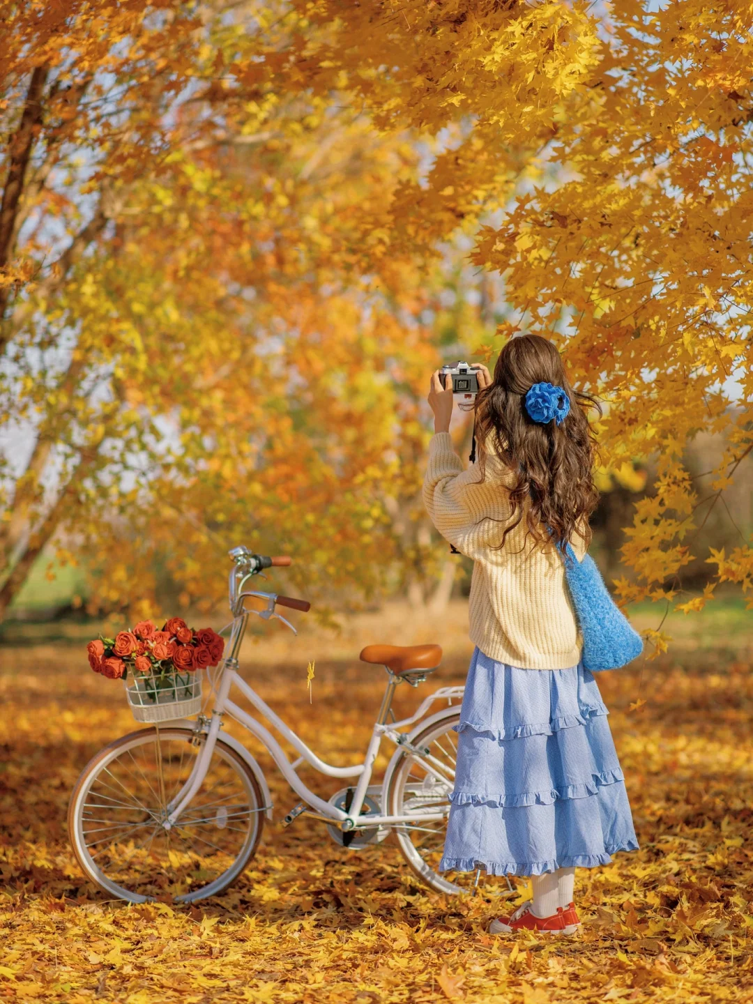 秋天公园落叶电影感拍照|骑进金黄色的秋天