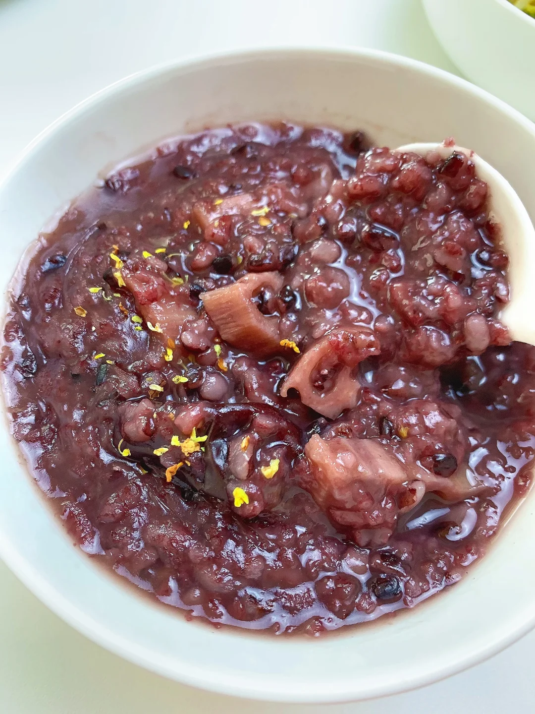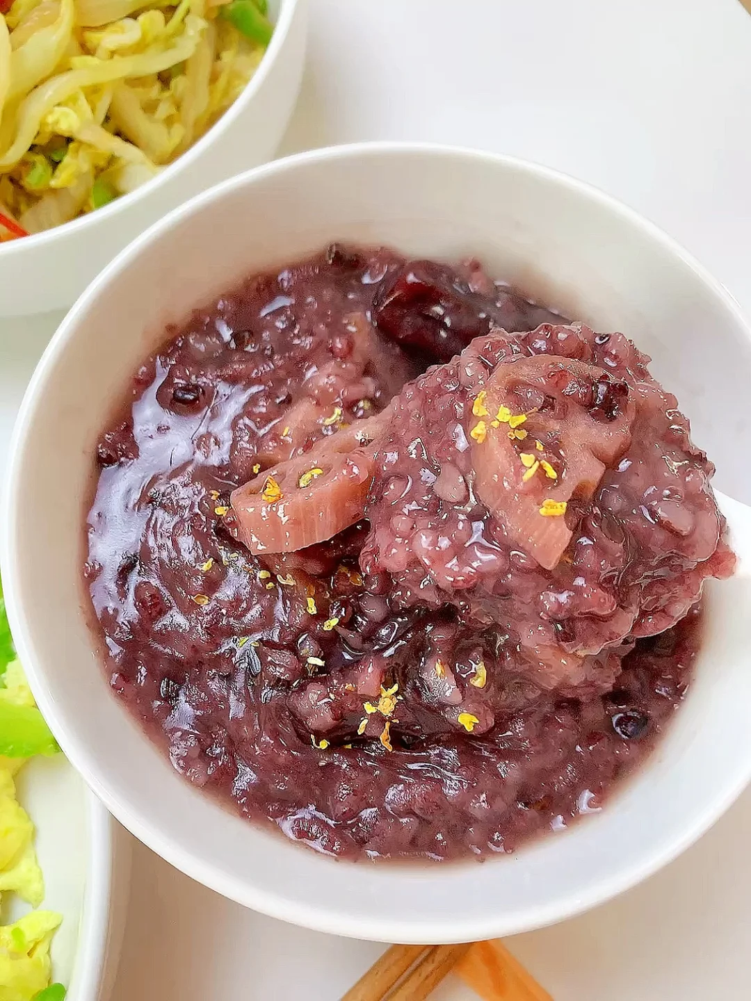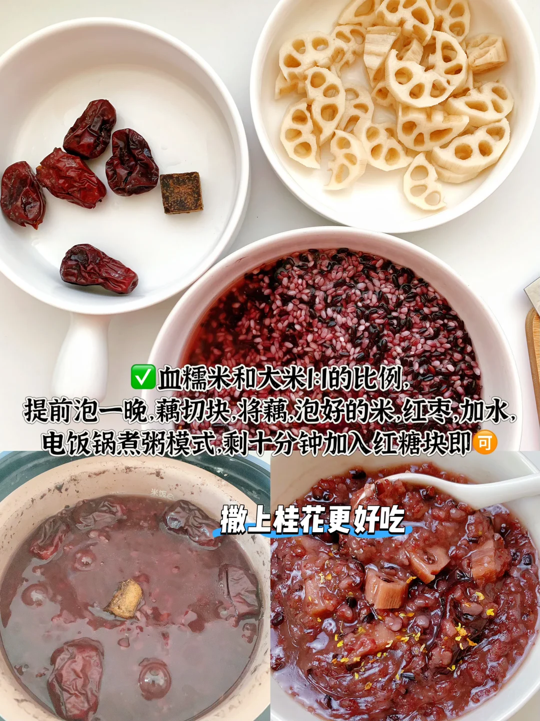 👩🏻🍳食材清单: [一R]血糯米半杯 [二R]大米半杯 [四R]莲藕一节 [五R]红枣5颗(喜欢可以多放点) [六R]红糖一块 [七R]桂花适量 🫕血糯米和大米提前泡一晚,将泡好的米,藕,红枣倒入电饭锅,煮粥模式煮熟,最后十分钟加入糖块,吃的时候加桂花即🉑 ……………………………………………………………………………… ✅暖胃又养颜,非常适合脾胃虚弱,气血不足的姐妹们~ ₍˄·͈༝·͈˄*₎◞ ̑̑
