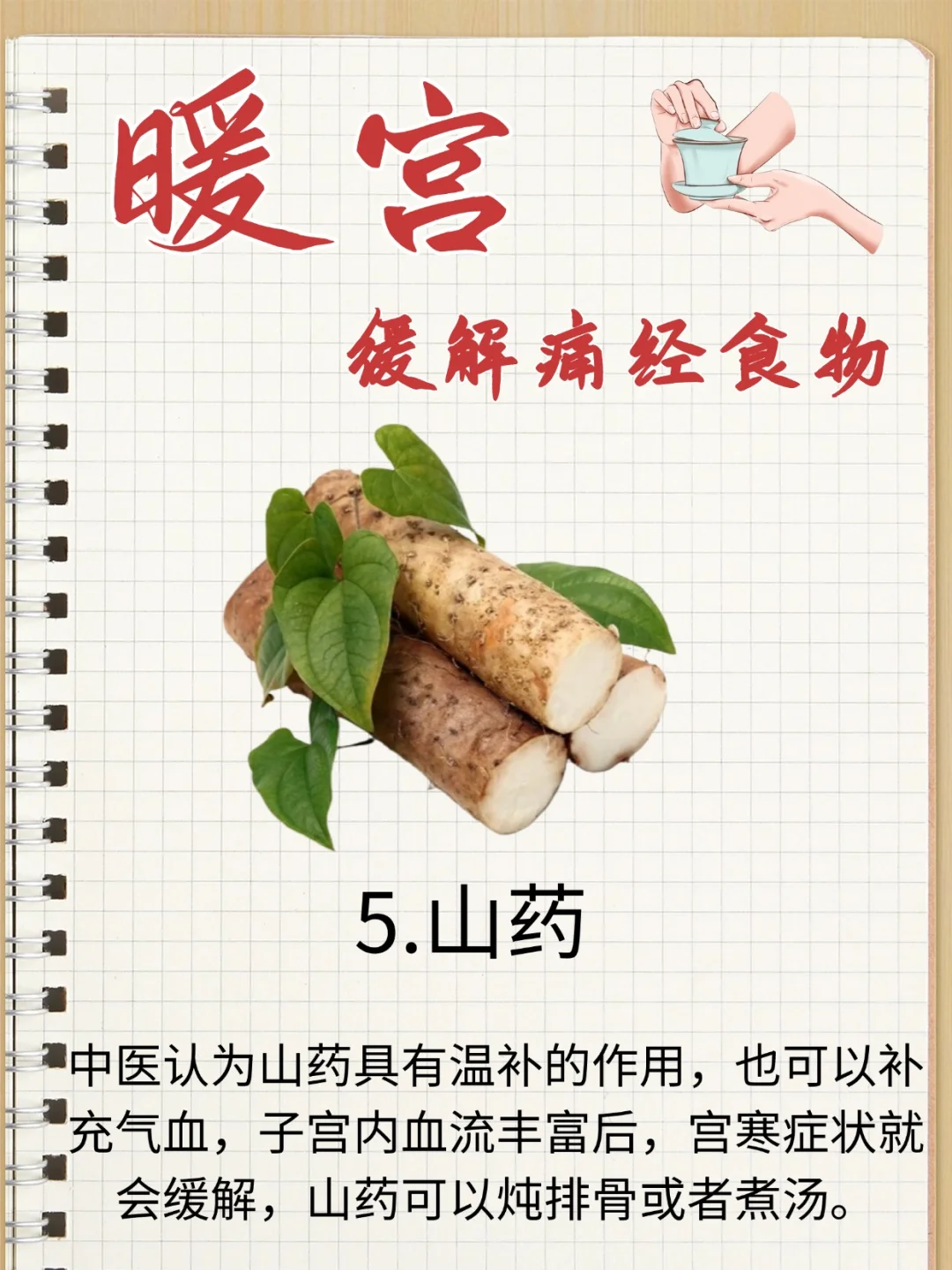 中医认为山药具有温补的作用,也可以补充气血,子宫内血流丰富后,宫寒症状就会缓解,山药可以炖排骨或者煮汤。