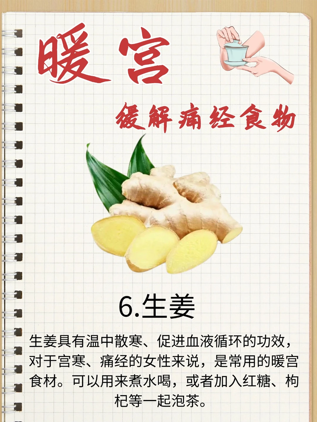 生姜具有温中散寒、促进血液循环的功效,对于宫寒、痛经的女性来说,是常用的暖宫食材。可以用来煮水喝,或者加入红糖、枸杞等一起泡茶。