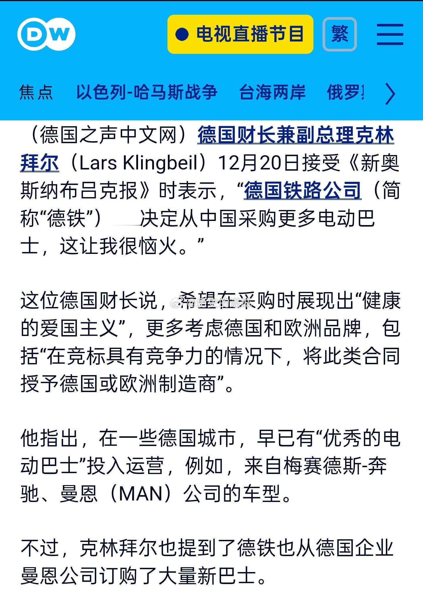 德国铁路公司近期宣布了其史上最大一笔巴士订单,订单绝大部分由德企曼恩公司提供,不过也有约200辆电动巴士将来自中国汽车制造商。对此,德国财政部长兼副总理克林拜尔对德铁提出批评,呼吁在采购时展现出“健康的爱国主义”,更多考虑德国和欧洲品牌,包括“在竞标具有竞争力的情况下,将此类合同授予德国或欧洲制造商”。