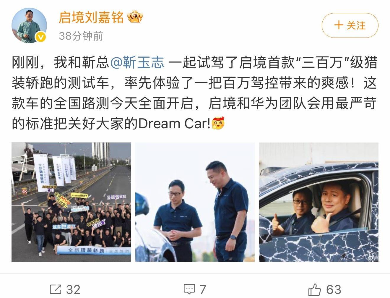 启境CEO刘嘉铭透露,启境首款车“猎装轿跑”F05(内部代号)已经开始全国路测!今天第一天就跟好伙伴华为乾崑车BU CEO靳玉志“齐齐”试车!过两天应该网上也会有网友分享启境路测的谍照图,我想看看它尾巴的轮廓设计和腰线怎么的哈哈哈!大v聊车