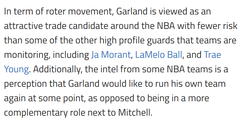 “一位消息人士表示:如果一支球队想升级控卫位置,加兰是交易市场上最稳妥的选择。有球队认为,他可以承担更大的责任。”
