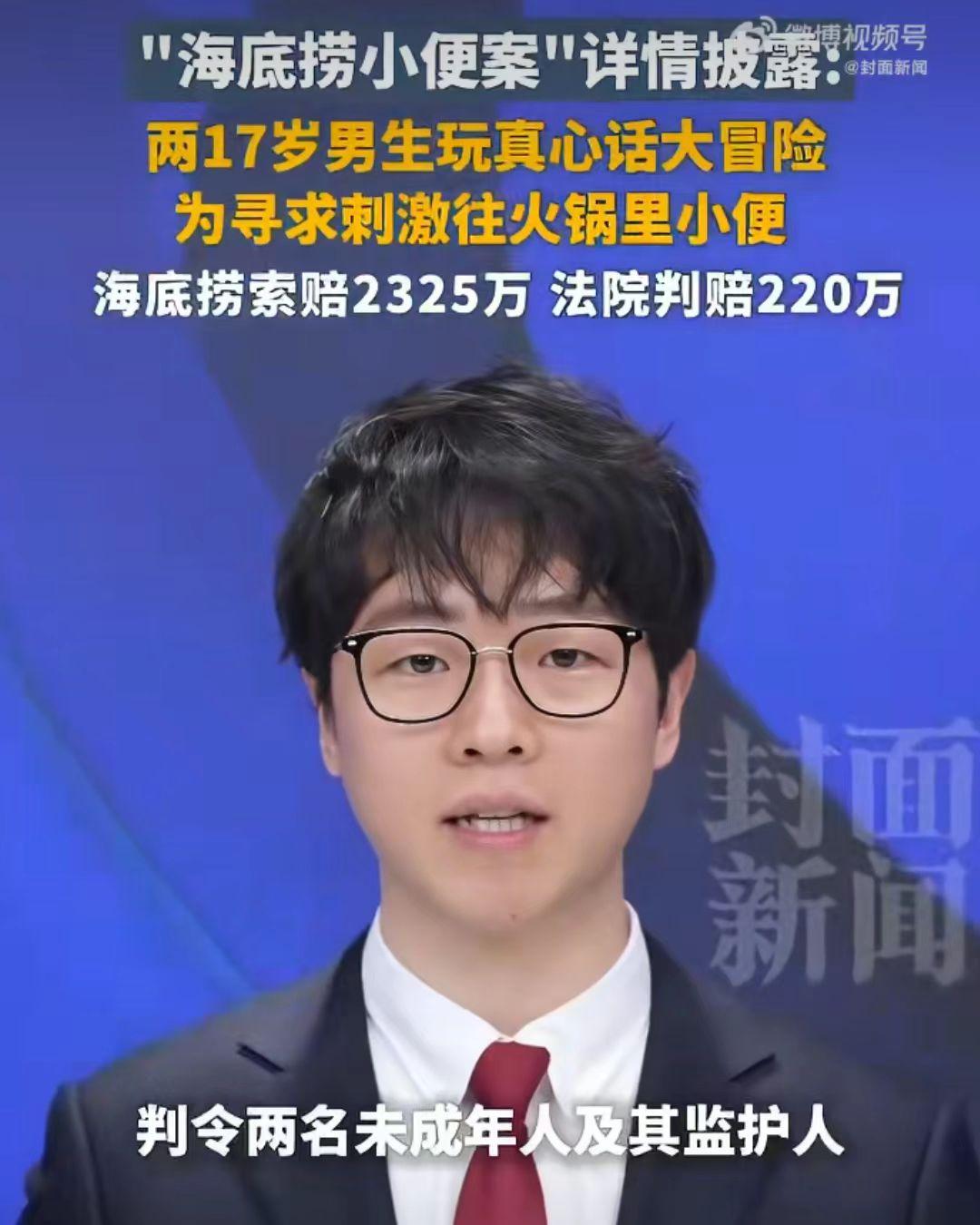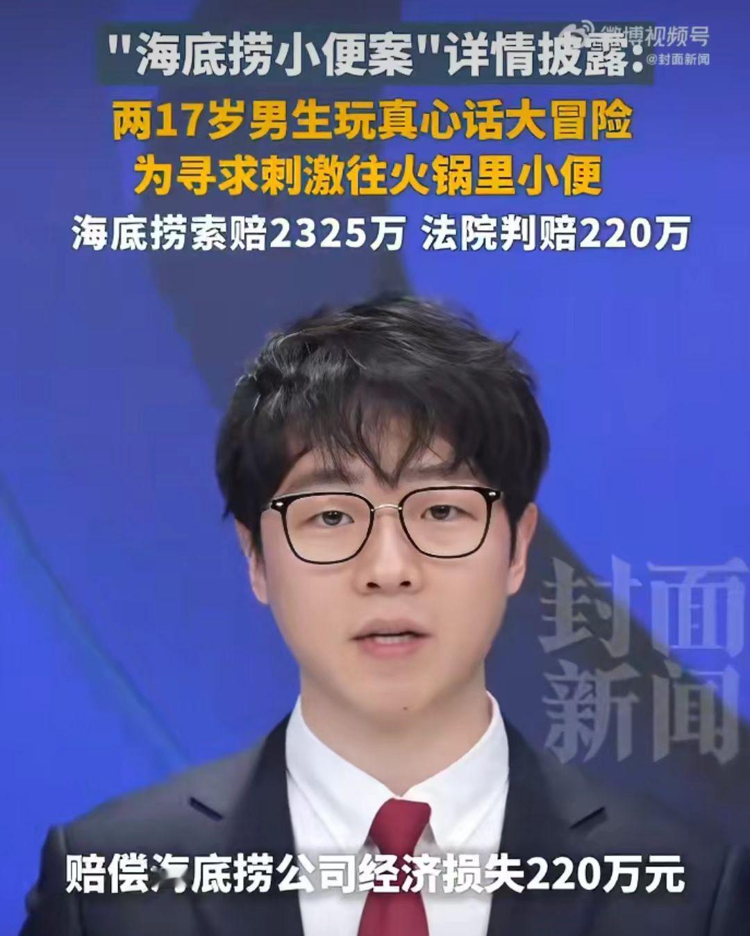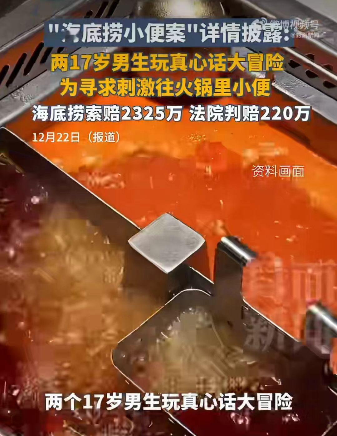 天价买单, 海底捞小便门事件判了, 父母为17岁的孩子付出天价赔偿220万。 家长终究为孩子的管教不严付出惨痛的代价。 2025年2月,17岁的两个孩子在上海一家海底捞吃火锅,令人想不到的是这两个孩子玩起了真心话大冒险,这本来也没什么,只是这个惩罚简直令人不止,输得那一方,往火锅锅底小便。 这个是人能干的事吗?锅是吃饭的,能往里面小便吗?更何况这是火锅店,人们经常来吃饭的地方。 这两个孩子更是拍了视频,把视频发到网上了。 这下网友炸了,在火锅店吃饭,还有人往锅里小便,以后是不敢到这家店吃饭了。 这下好了全火了,孩子火了,海底捞也火了,海底捞老板也火了。 这件事发生后,基本上很多人都不敢去吃火锅了,海底捞的名誉严重受损,老板为了挽回声誉,就决定把那段时间在海底捞吃饭的顾客全额赔偿,一共赔偿顾客2325万元。 可以说是损失惨重,后期生意好不好还不好说。 老板觉得很冤枉,不是自己犯的错,却要自己买单,这个上千万的单自己也亏不起啊! 3月14日,海底捞老板向法院起诉,把俩孩子的父母给告了,要求赔偿2325万元。 2025年12月22日,海底捞小便法院审理认定,小唐、小吴的行为构成共同侵权,损害海底捞财产权与名誉权,合计 220 万元,由二人监护人承担。一审判决作出后双方均未上诉,判决已生效。 不要拿孩子小不懂事作为借口,否则终究要为孩子不懂事行为付出惨痛的代价。
