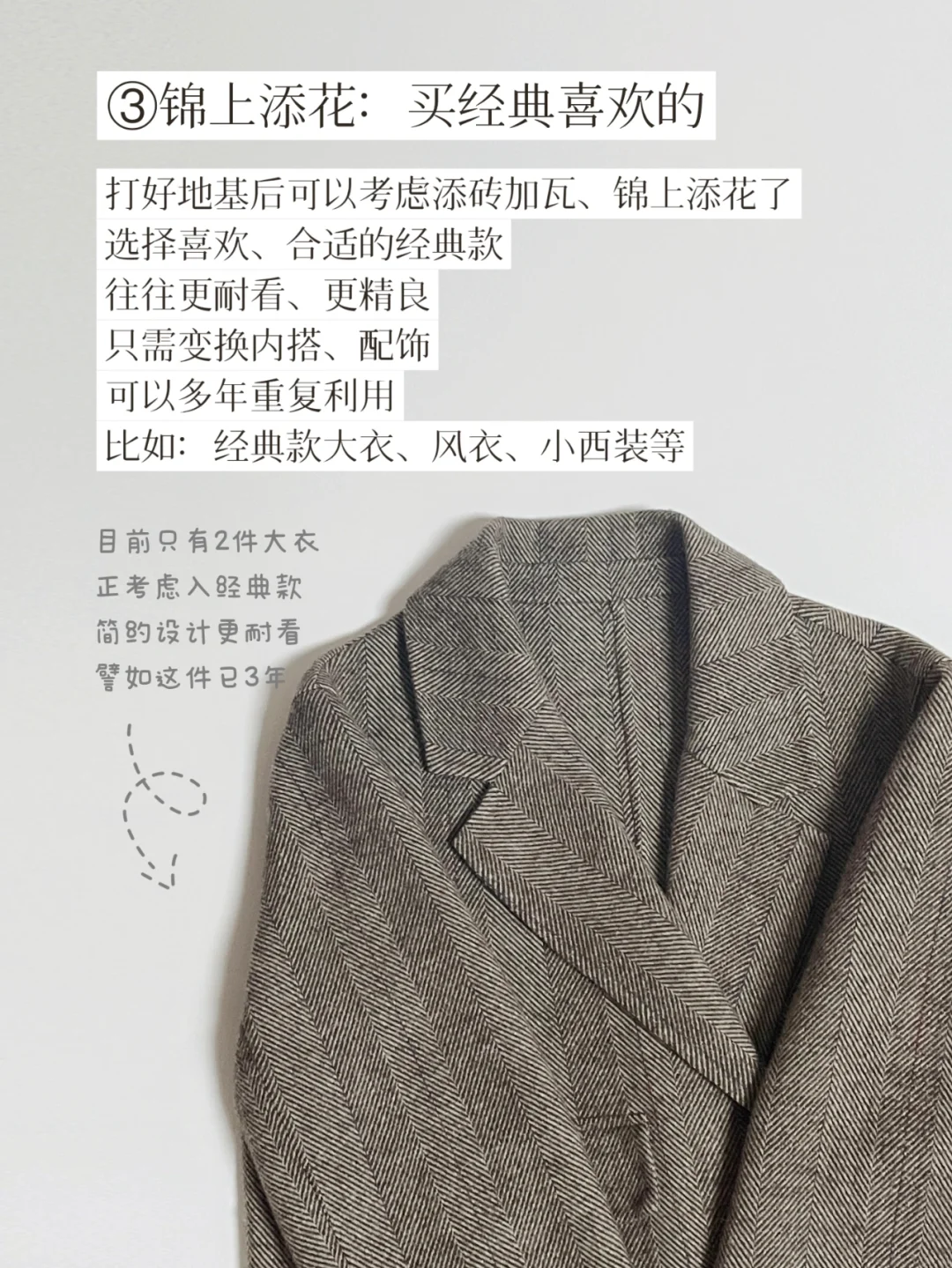 打好地基后可以考虑添砖加瓦、锦上添花了。选择喜欢、合适的经典款,它们经过时间的考验往往更耐看、更精良,只需变换内搭、配饰,可以多年重复利用。