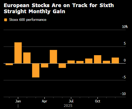 欧洲基准股指上周多次创历史新高,主要受市场对政策进一步放松的乐观预期以及美国经济增长坚韧提振。该指数有望实现连续第六个月上涨。不过,尽管今年以来累计上涨约16%,欧洲股市的表现仍落后于全球股市。
