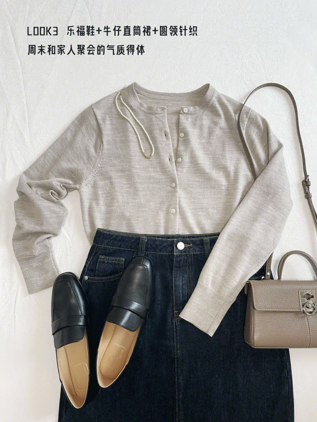 ▫️乐福鞋+直筒半身裙+圆领针织,气质得体