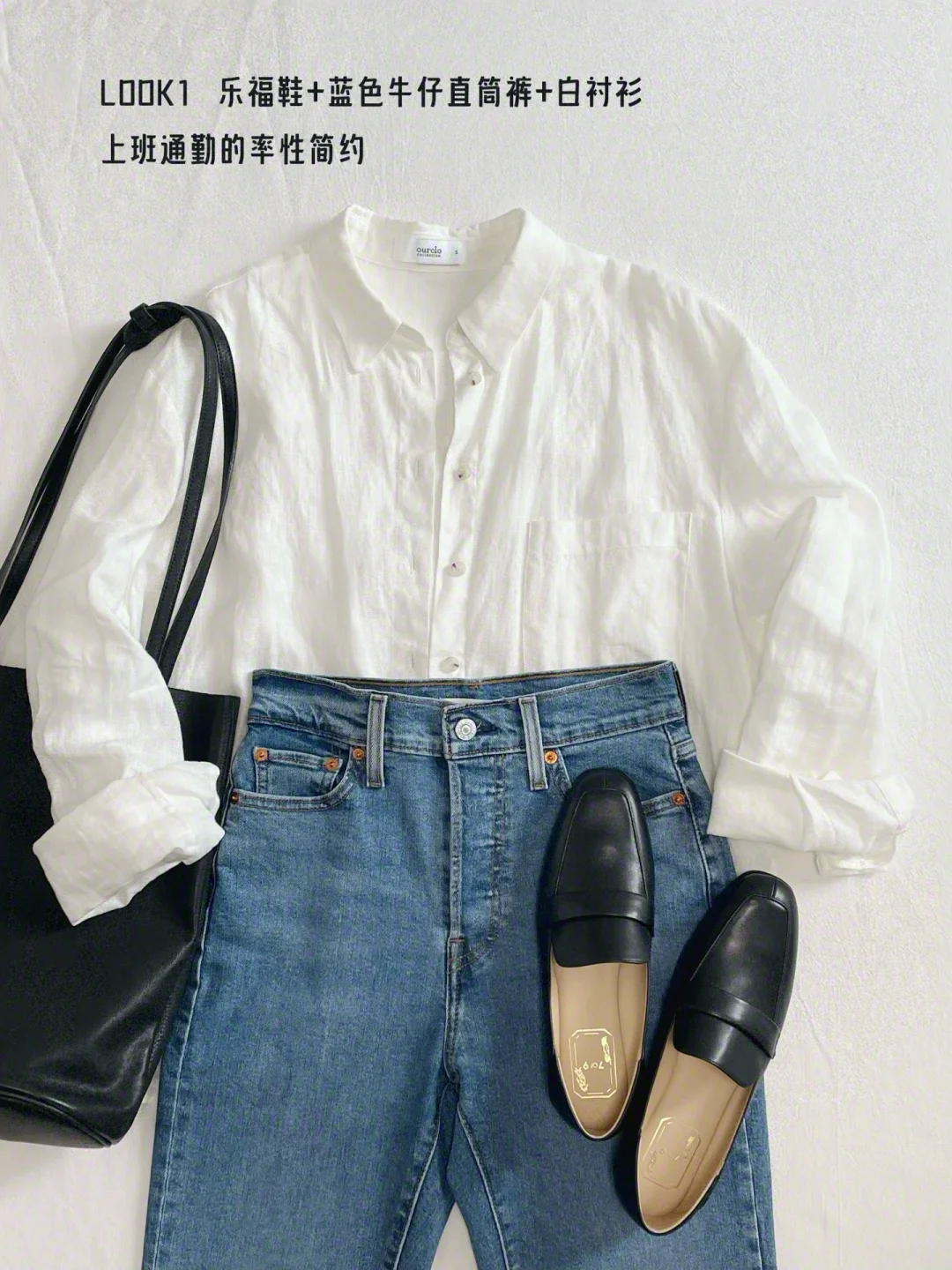 ▫️乐福鞋+牛仔直筒裤+白衬衫,率性简约