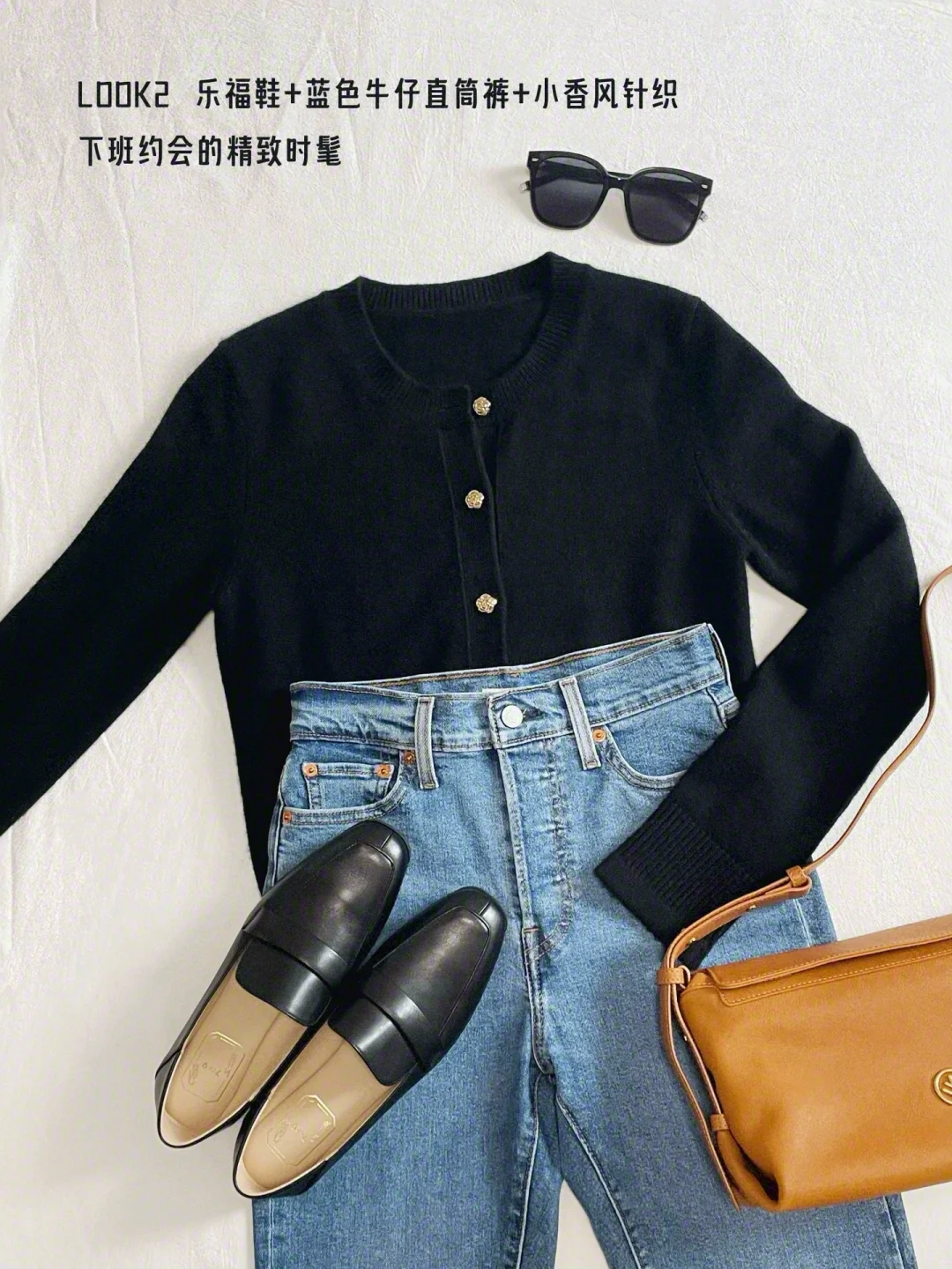 ▫️乐福鞋+牛仔直筒裤+小香风针织,精致时髦