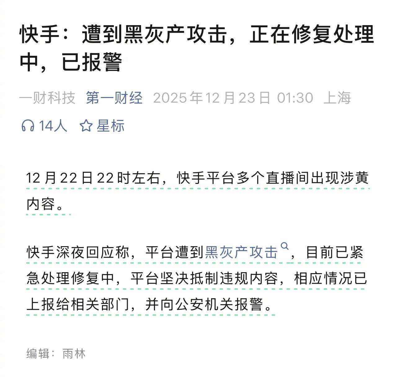 快手重大事故,大量直播涉黄,快手深夜回应:遭到黑灰产攻击,已报警。12月22日晚,快手直播平台突发大规模违规内容,众多网友反映快手直播间出现大量色情内容,包括播放淫秽影片、主播裸露低俗表演等行为,有的直播间直播单场观看量甚至逼近10万人。随后,各平台多名网友发帖称“举报都没用”、“疯了吗”、“辣眼睛”、“快手今晚没有管理员吗?”事件发生后,快手紧急封禁相关直播间,至23日凌晨直播页面已被清空。12月23日0点30分许,有记者向北京公安局海淀分局反映了前述问题,接线工作人员表示,目前已接到多个群众报案,正在了解相关情况。一名东莞的网友也报警举报快手涉黄,110接警中心回应:举报快手涉黄对吧,已有警员正在处理中,让网友放心。快手深夜回应称,平台遭到黑灰产攻击,目前已紧急处理修复中,平台坚决抵制违规内容,相应情况已上报给相关部门,并向公安机关报警。快手快手直播