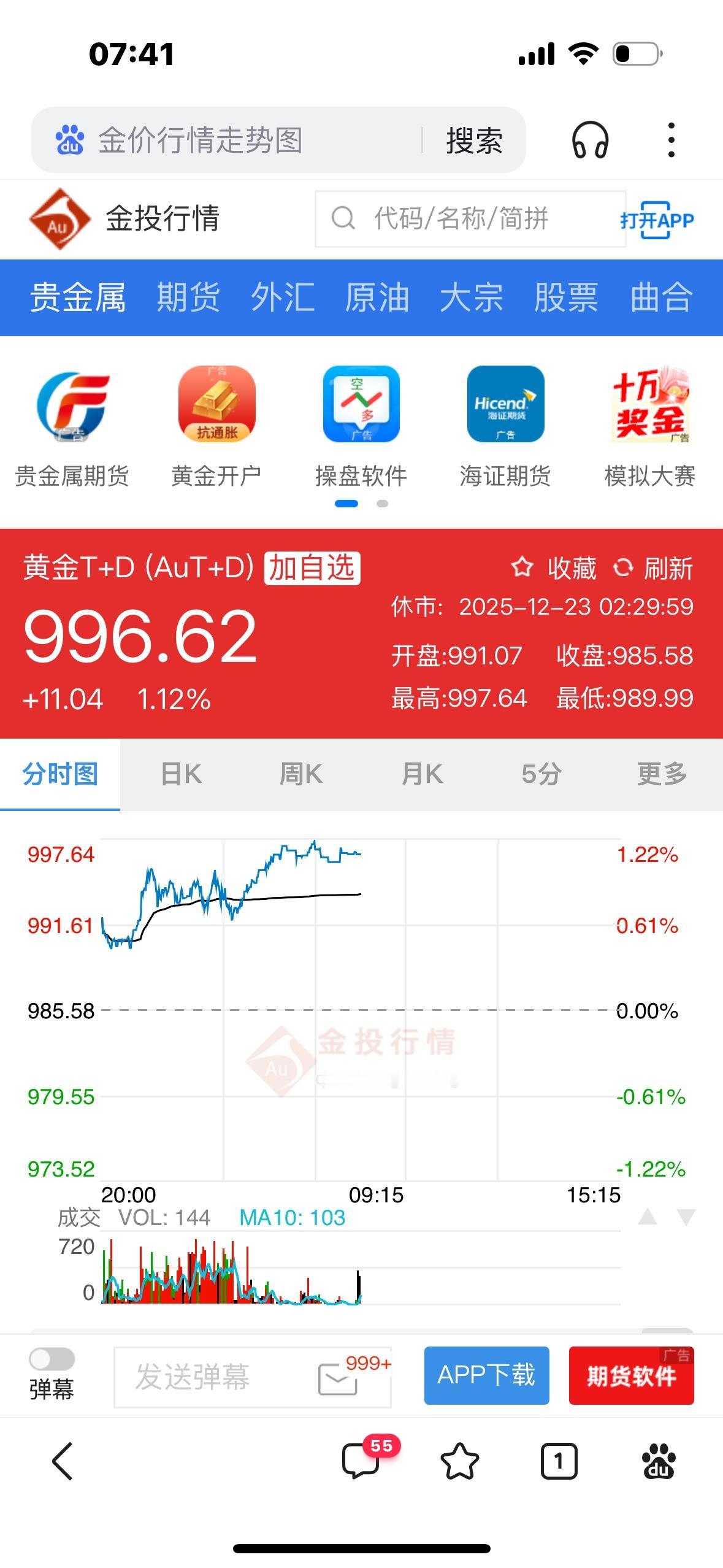 今日黄金早盘:2025年12月23日7时,国际金价4454.46美元/盎司,国内金价996.62元/克。今日金价将涨到1000元每克,长势太猛了,连续两天刷新纪录,爆了。从2004年到2024年,黄金年均价格从84元/克飙升至557元/克,20年间涨幅超563%!2025年以来,国际现货黄金回报率已达68%。黄金的属性再次体现黄金行情价格 金价 实时金价