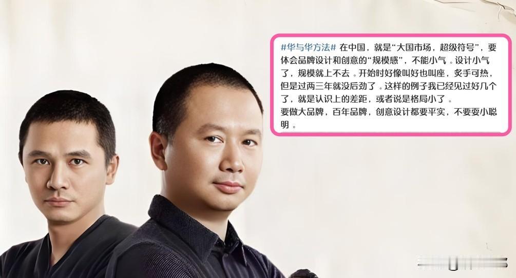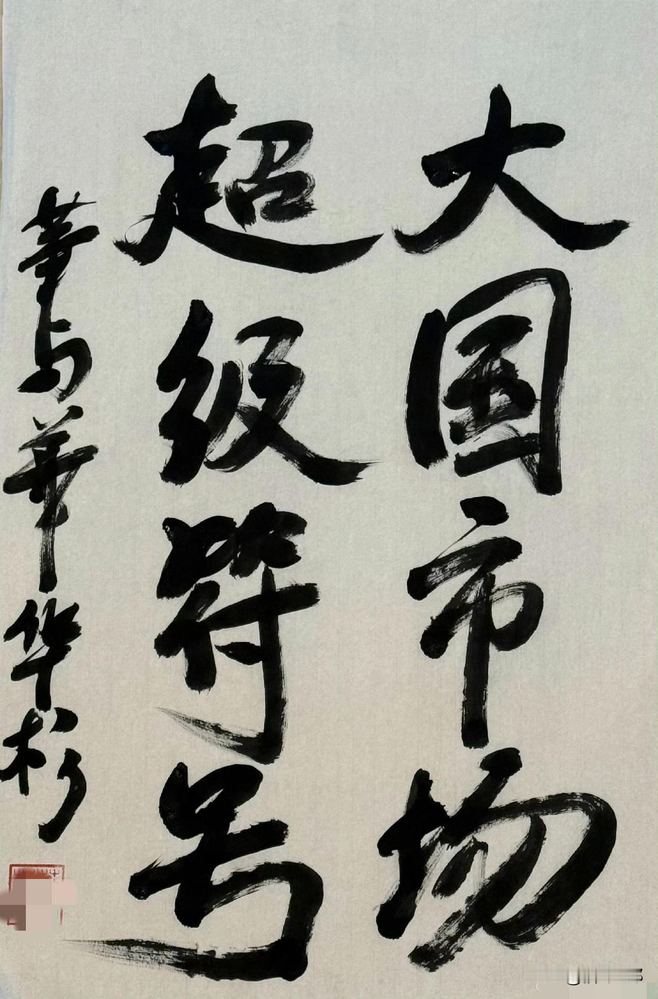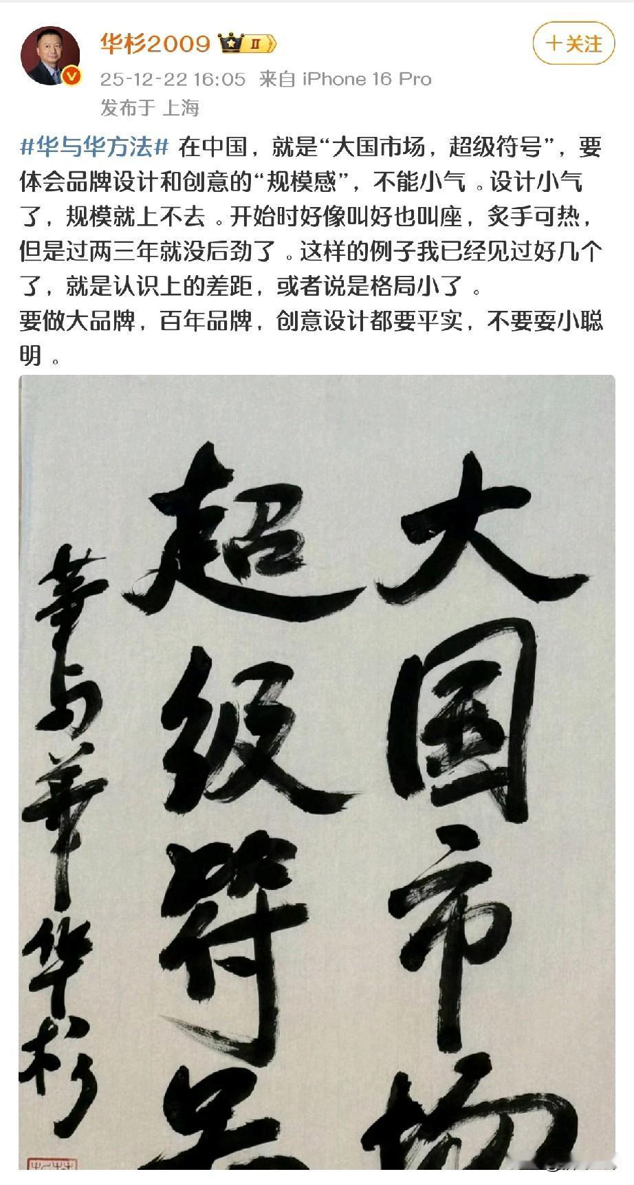 华杉书法欣赏 老话“字乃人衣冠,物似主人形”说得没错 看到华总的书法,有一种“大且圆”风格,有没有觉得怎么看怎么像他的形象和风格? 华总秀出来的这幅书法作品,是近日秀在社交平台上的作品。 配文:“就是‘大国市场,超级符号’,要体会品牌设计和创意的‘规模感’,不能小气。”、“要做大品牌,百年品牌,创意设计都要平实,不要耍小聪明。” 这配文也是像这幅书法作品一样“大气”和“圆润”! 华老板的书法,你觉得怎么样? 有没有觉得无论从字形和风格上,都很像华总其人? (素材来源于:微博)