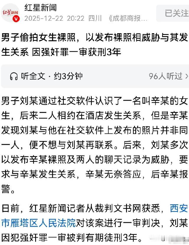 陕西西安,一名女子通过网络结识一名男子,两人交往不到一个月便相约去酒店开房,见面后女子发现对方与照片不符,但还是发生了关系,事后女子想断联,男子却威胁要将聊天记录和女子照片公开,女子无奈再次与男子发生亲密行为,可男子仍不满足,继续威胁。女子忍无可忍报了警,男子的行为,最终被判三年。 (来源:红星新闻) 女生辛某,是在校学的大学生,对爱情,自然是充满了美好的向往。 2024年6月,她在交友软件上认识了刘某,刘某照片帅气,两人网上聊得火热,很快约好去酒店见面。 辛某满心欢喜,精心打扮后前往约定酒店赴约,她怀揣着对爱情的憧憬,心里像揣了只小兔子,砰砰直跳。 可当她见到刘某的那一刻,瞬间没了笑容,刘某和照片里判若两人,差距真是离谱他妈给离谱开门,离谱到家了。 当时,辛某的心里落差很大,眉头都紧皱着,满是失望,她本想转身就走,可刘某巧舌如簧,一番甜言蜜语哄得辛某晕头转向。 稀里糊涂间,两人竟发生了关系。 事后,辛某肠子都悔青了,她觉得自己太冲动,决定和刘某断绝联系。 可刘某哪肯轻易放过她,他威胁辛某,要把聊天记录和她的照片发到学校。 辛某一听,想到自己还在上学,这事要是传出去,自己以后还怎么做人,在学校里还怎么抬得起头。 无奈之下,辛某只能再次赴约。 再次见到刘某,辛某满脸的不情愿,可刘某根本不管她的感受,又强行与她发生了亲密的关系。 期间,刘某还偷偷拍下辛某的裸照,以此作为继续威胁她的把柄。 刘某拿到照片后,更加肆无忌惮,提出了更多无理的要求。 辛某苦苦哀求,希望刘某能放过她,可刘某却不为所动,反而变本加厉地威胁她。 辛某感到绝望无助,她整日以泪洗面,精神恍惚,学习成绩也一落千丈,同学们都察觉到她的异常,纷纷关心询问,可她有苦说不出,只能强颜欢笑。 在痛苦和煎熬中,辛某终于忍无可忍,她意识到,一味地妥协退让只会让刘某更加得寸进尺,自己必须勇敢地维护自己的权益。 于是,辛某报了警。 民警接到报案后,高度重视,通过技术手段,很快锁定了刘某的行踪。 在掌握了充分证据后,民警果断出击,将刘某抓获归案。 在审讯室里,刘某还试图狡辩,他眼神闪烁,言辞闪烁其词,拒不承认自己的罪行。 可面对民警出示的证据,他最终不得不承认自己的所作所为。 原来,刘某是个游手好闲、不务正业的人。 刘某平时就靠在网上骗取女孩的感情来满足自己的私欲,他故意用帅气的照片吸引女孩,然后骗取她们的信任,再实施威胁和侵犯。 《刑法》第236条规定,以暴力、胁迫或者其他手段强奸妇女的,处三年以上十年以下有期徒刑。 刘某偷拍辛某裸照后,以此为把柄,不断威胁辛某,迫使辛某多次与他发生了关系。 刘某的行为,完全就是利用威胁手段,违背了辛某的意愿,强行与她发生了关系,符合强 奸 罪的范畴。 这就好比有人拿着刀逼着你做你不愿意做的事,你没办法反抗只能照做,这就是典型的违背他人意志。 刘某就是利用偷拍的裸照作为威胁的条件,逼迫辛某就范。 《民法典》第1032条规定,自然人享有隐私权。任何组织或者个人不得以刺探、侵扰、泄露、公开等方式侵害他人的隐私权。 刘某偷拍辛某的 裸 照,这明显就是刺探、侵犯辛某隐私的行为,严重侵害了辛某的隐私权。 辛某完全有权要求刘某停止侵害、消除影响、赔礼道歉,甚至还可以要求赔偿损失。 一审法院经过审理认为: 刘某偷拍辛某的裸照,并以此威胁她多次发生了关系,完全违背了辛某的意志,其行为已构成 强 奸 罪。 最终,法院判决刘某有期徒刑3年。 有人对辛某的遭遇表示同情,认为她是不幸的受害者,希望她能早日走出阴影,重新开始新的生活。 也有人对刘某的行为表示愤慨,认为他道德败坏,应该受到法律的严惩。 在网络交友时一定要谨慎小心,提高自我保护意识。不要轻易相信陌生人的甜言蜜语,不要随意透露自己的个人信息和隐私。