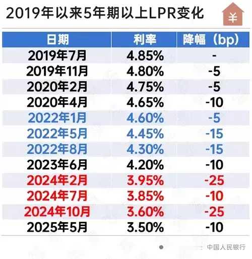 2025年5月20日央行宣布下调政策利率0.1个百分点,带动LPR下行0.1个百分点。这是2025年首次也是年内唯一一次LPR调整。