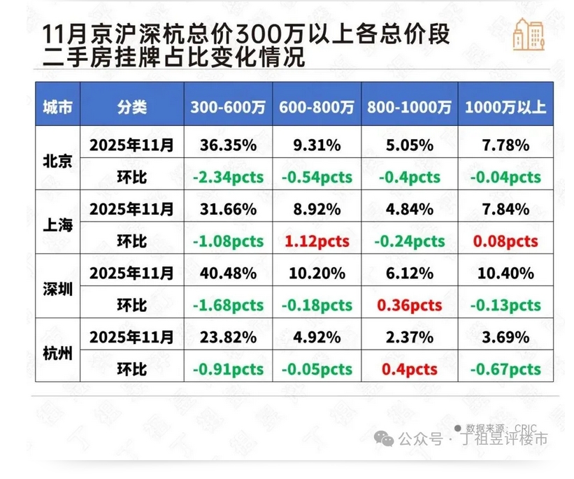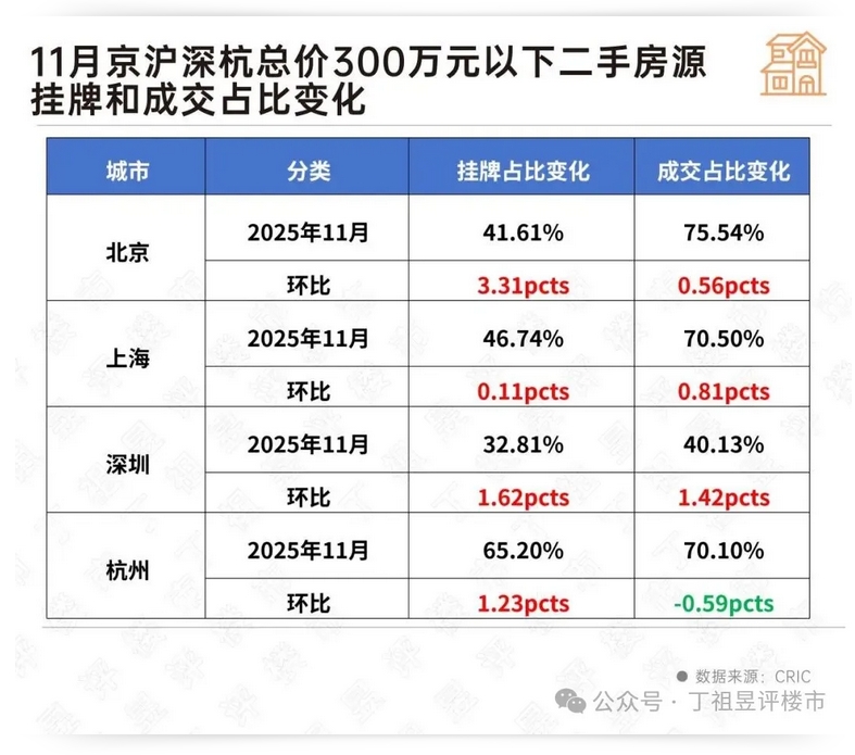数据显示,北京、上海、深圳和杭州四大城市300万元以下低总价房源挂牌占比较上月均有所上升,环比分别增3.31个百分点、0.11个百分点、1.62个百分点和1.23个百分点。刚需总价段房源业主挂牌积极性回升,且增幅显著,低总价业主抛售心理加剧。