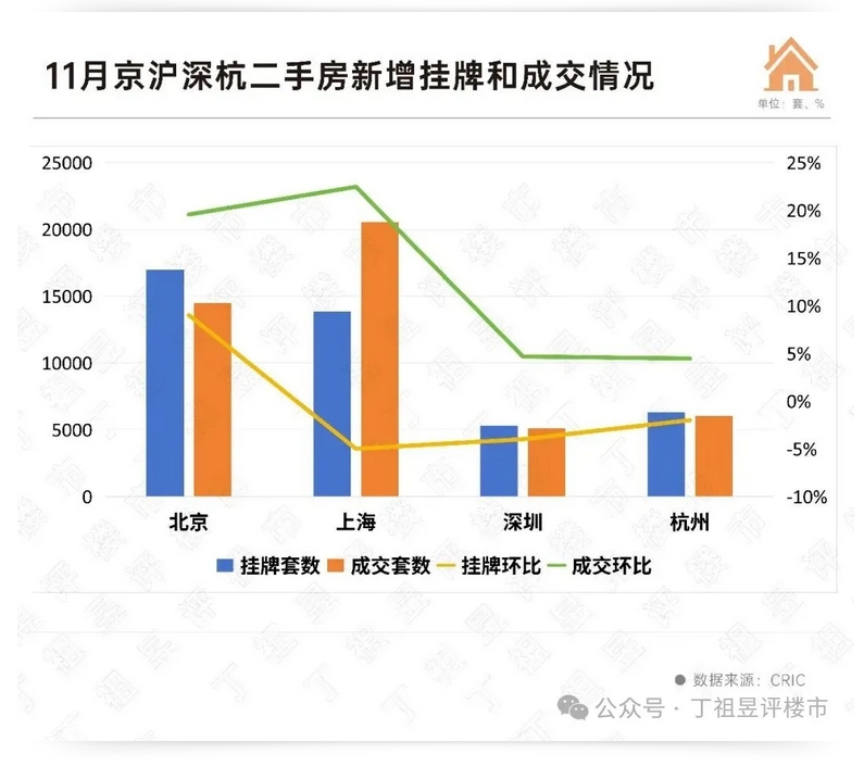 聚焦北京、上海、深圳、杭州等核心一二线城市,从CRIC监测的四城新增挂牌套数来看,11月四城新增挂牌总量与上月基本持平,环比微增1%,同比下降7%。上个月是同环比齐跌。