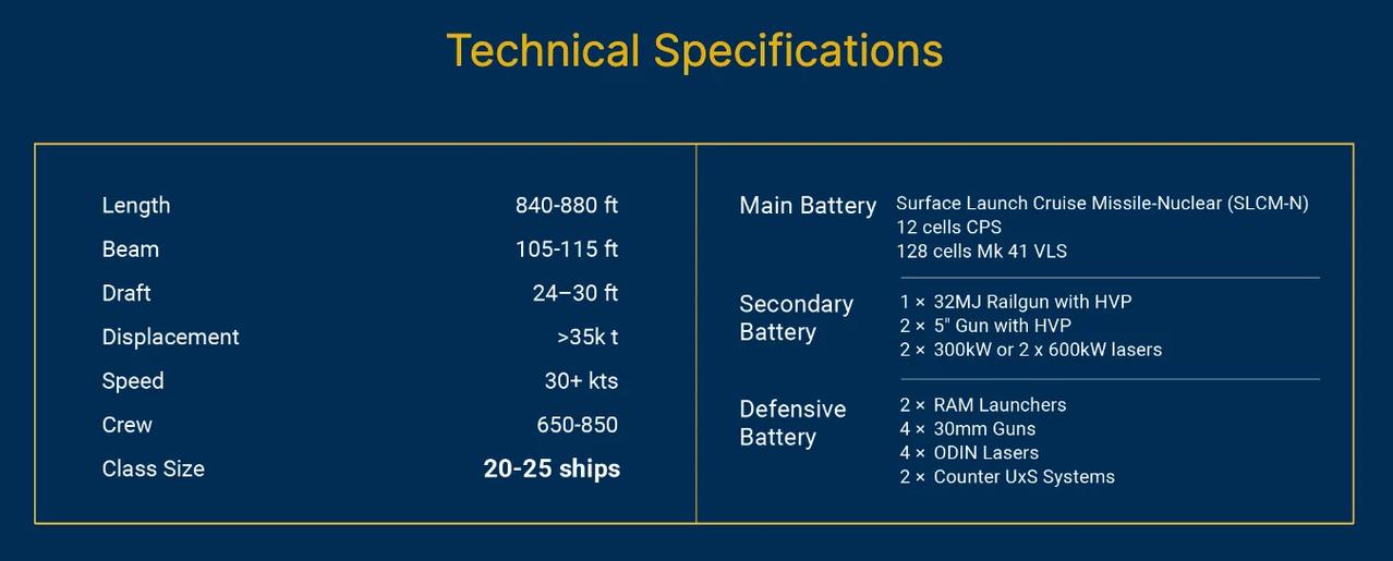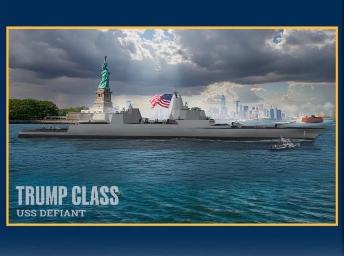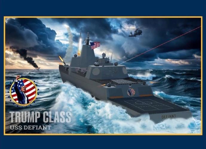 装备电𥔵炮和激光武器,排水量大于35,000 吨,美国海军最终确定建造“特朗普”级战列舰(Trump Battleship)。首批建造两艘,最终建造数量将达20至25艘。首舰被命名为“无畏”号。 该级舰长256–268 米、 型宽32.0–35.1 米、 吃水 7.3–9.1 米 、排水量> 35,000 吨 、航速30+ 节 、舰员配置 650–850 人。 主武器: 核巡航导弹(SLCM-N) 、12 单元 CPS(常规快速打击系统) 、128 单元 Mk 41 垂直发射系统。 副武器 1 × 32 兆焦(MJ)电磁轨道炮(使用 HVP 高速弹)、 2 × 127 毫米(5 英寸)舰炮、 2 × 300 千瓦 或 2 × 600 千瓦 高能激光武器、 2 × RAM 近程防空导弹发射器、 4 × 30 毫米机关炮、 4 × ODIN 激光致盲/反无人机系统、 2 × 反无人系统(Counter-UxS)。 飞行甲板和机库可容纳V-22“鱼鹰”倾转旋翼机以及下一代垂直起降飞机。