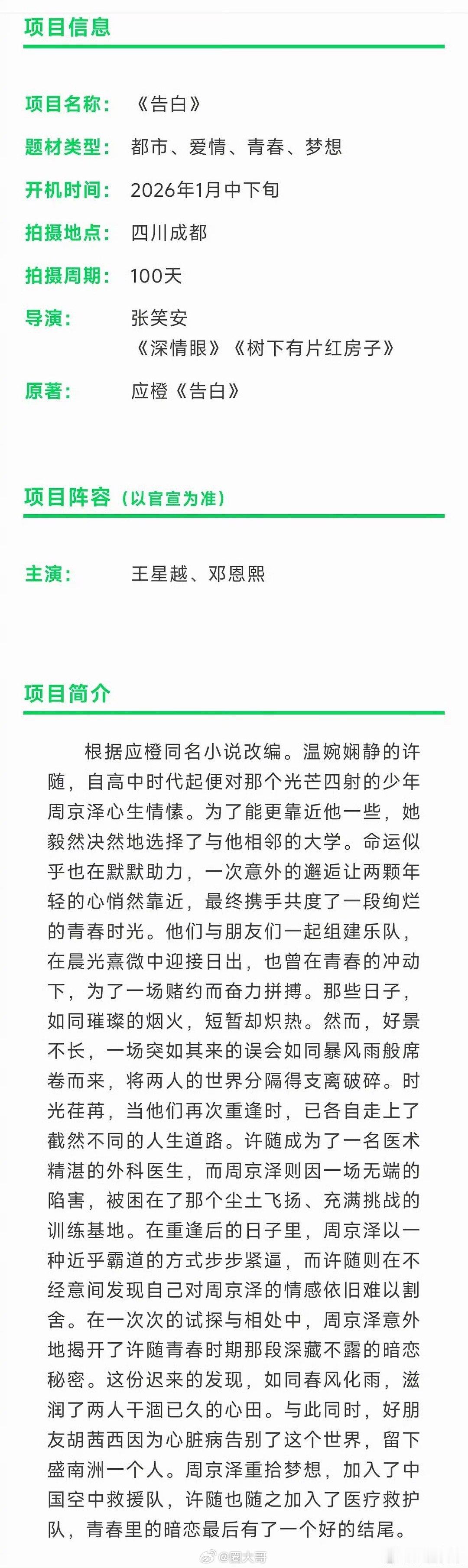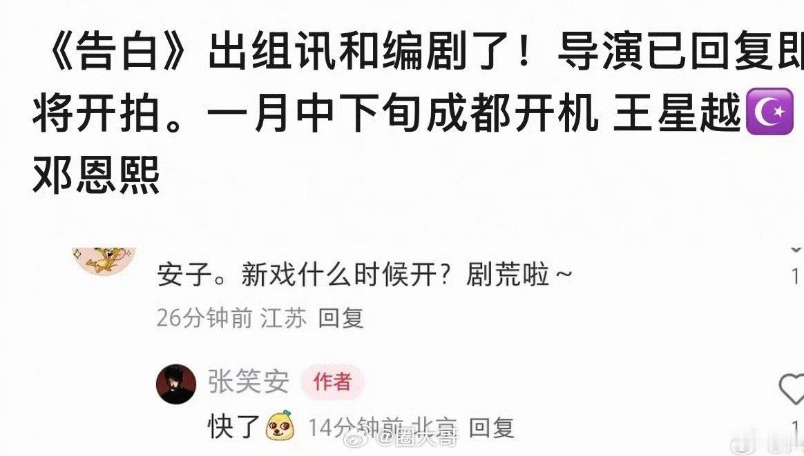 王星越告白开机预热王星越这是要进组《告白》的节奏了吧,粉丝已经开始为王星越新剧开机预热了,看得出来王星越要进组了,不过话说回来,这部剧原定男主陈飞宇因为档期不接这部戏,会不会来个友情客串呐~王星越即将进组告白