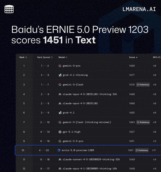 12月23日,LMArena大模型竞技场发布最新排名,文心新模型ERNIE-5.0-Preview-1203以1451分登上LMArena文本榜,排名中国第一。在创意写作、高难度指令等方面表现突出,超过Claude-Opus-4-1、GPT-5.2、GPT-5.1、和Qwen3-Max-Preview等多款国内外主流模型。