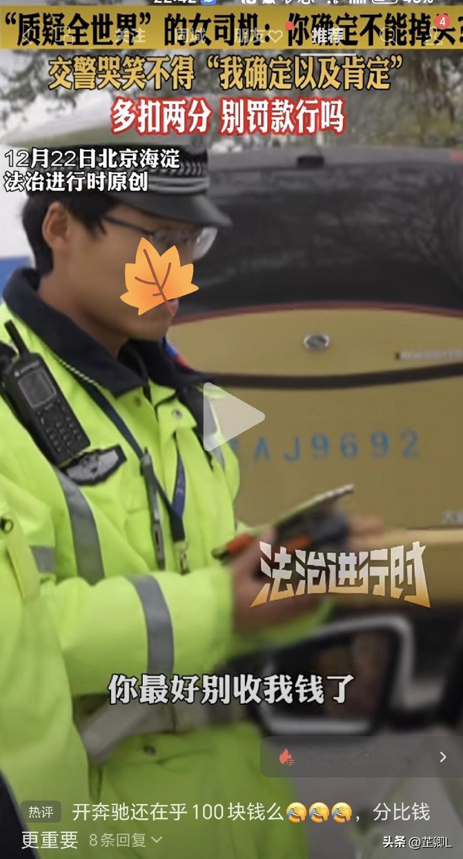 奔驰女司机压实线掉头被拦,跟交警讨价还价:分我多得是,钱能不扣吗? 12月22日,北京海淀街头,一辆奔驰车“咔咔”压过四条黄白实线,表演了一个任性掉头。 交警二话不说就给她拦下了。没想到,接下来的对话比小品还精彩。 女司机摇下车窗第一句就带着灵魂拷问:“你确定吗?这块不能掉啊?” 交警都被问乐了:“确定以及肯定,女士,咱科一科三都学过啊,这双黄线双白线,有一条黄实线白实线就不能掉头了!更何况四条呀!” 女司机试图拉个垫背的:“能掉头吧,大家都在这儿掉啊,不是我一人在这儿掉!” 交警指了指前方:“刚刚不就您一个嘛!咱不看别人,咱自己黄实线白实线是不能掉头的。从前面路口黄虚线那位置掉头!” 眼见道理讲不通,女司机画风突变,开始现场搞“促销”:“这是扣多少钱啊?” 交警:“100元,1分啊。” “扣两分吧,我不要分,别扣我钱了!”这波操作直接把交警整不会了。 交警哭笑不得:“这不行,女士。” “我不要分,我分用不了。”女司机一脸“分我大把,随便扣”的阔气。 交警憋着笑坚持原则:“按法律规定,是多少分就是多少分!” 最后这位姐们儿祭出“王炸”:“你扣我3分,我没意见,你最好别收我钱了。” 这段神对话被传到网上后,评论区秒变段子手大会: “姐,分要不送我?我快不够用了!” “交警内心:我今天是不是遇到隐藏土豪了,分居然能当钱花?” “建议和之前‘拿驾照抵分’的那位大哥认识一下,你俩能合作。” “这波属于是:分有余而钱不足,古代得叫‘分阀’。” 说真的,路上标线不是摆设,实线就是一堵“看不见的墙”。压线掉头、随意变道,万一撞了可就不是100块的事儿了。 年底了,路上车多,各位司机朋友宁可多绕半里路,也别抢这一把方向。安全到家,比啥都强! 道路千万条,安全第一条;实线不能压,钱包保护好! 信息来源于法治进行时,侵联删!