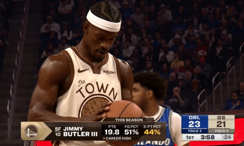 赛中转播方给出数据,本赛季吉米-巴特勒三分命中率44.2%,生涯最高。