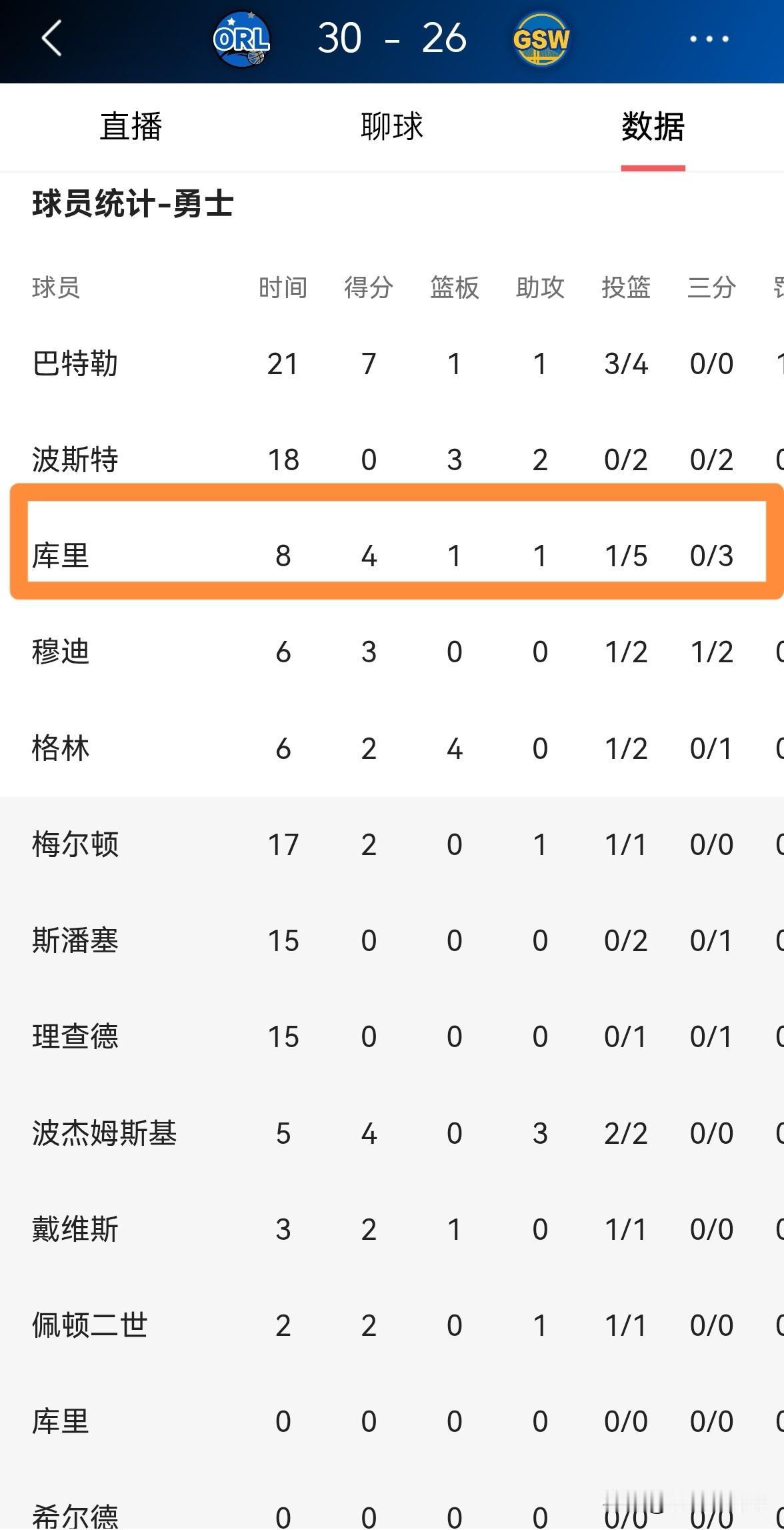 勇士当家球星库里真是一个浪投王!在今天勇士主场迎战魔术的比赛中,目前双方的第一节比赛已经结束,勇士以26:30落后于对手。让我感到尤其愤怒的是,在第一节比赛中,库里在手感不佳的情况下依然出手5次,仅仅命中1球得到可怜的4分。 在我看来,库里在手感糟糕的情况下就应该多传球而不是一味地出手,毕竟对手对他的防守太过严密了,希望库里能够在接下来的比赛中打得更加聪明合理。