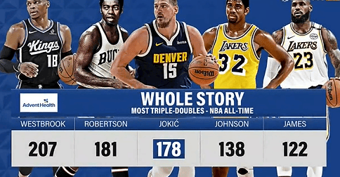 根据NBA官方数据统计:约基奇个人职业生涯已取得178次三双,距离历史第二名奥斯卡-罗伯特森还差3次。