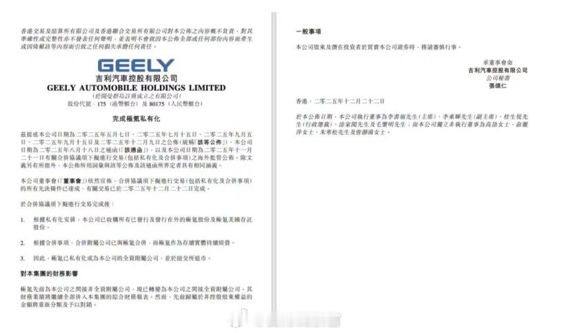 这条微博我们深入聊一下「极氪正式回归吉利汽车」这件事。12 月 22 日,大吉利体系的港股上市公司(吉利汽车控股有限公司)发布公告,宣布完成了极氪的美股上市主体(极氪智能科技控股有限公司)的私有化以及合并事项的交易。这意味着,极氪成为吉利汽车的全资附属公司,而极氪也将于纽交所退市。伴随着这一合并动作,港股上市公司(吉利汽车控股有限公司)成为大吉利体系下的核心上市公司主体,它将涵盖包括极氪、领克、银河、吉利燃油车等在内众多汽车业务。其实从吉利的角度来说,这也意味着,伴随着新能源汽车大潮而到来的汽车品牌攻城略地的阶段,已经彻底地结束了。这也未尝不是整个中国新能源汽车产业走向收敛的一个例证。对于吉利汽车集团来说,极氪回归到吉利,好处在于协同的力量,包括研发协同、供应链协同、品牌协同、财务协同甚至于渠道协同。这样做可以确实大幅度降低成本,提升企业运行的整体效率,更好地发挥规模效应。这也符合吉利去年下半年发布的「台州宣言」的精神。而与此同时,吉利汽车将如何在极氪回归的情况下,做好极氪的技术赋能、产品定义(尤其是产品区隔)、品牌高端化、用户社区维护,这是一个值得观察的问题。坦白地说,极氪品牌成立四年多以来,还是为大吉利体系的新能源转型做出了巨大贡献的。但如今,无论如何,吉利新能源转型的接力棒交到了 80 后淦家阅手里,这个交棒过程也算是非常成功——也算是一个新的起点。祝贺吉利,也为极氪祝福。308_IO新能源汽车极氪