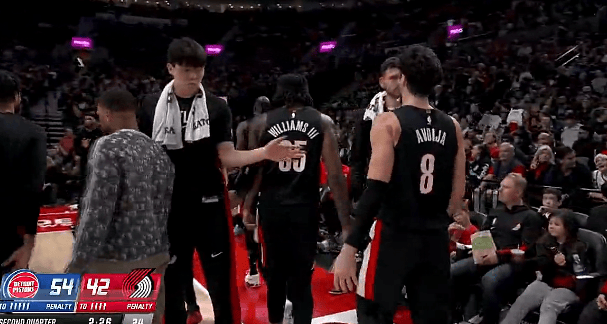 有机会吗?开拓者次节落后活塞12分,杨瀚森替补席挂着毛巾
