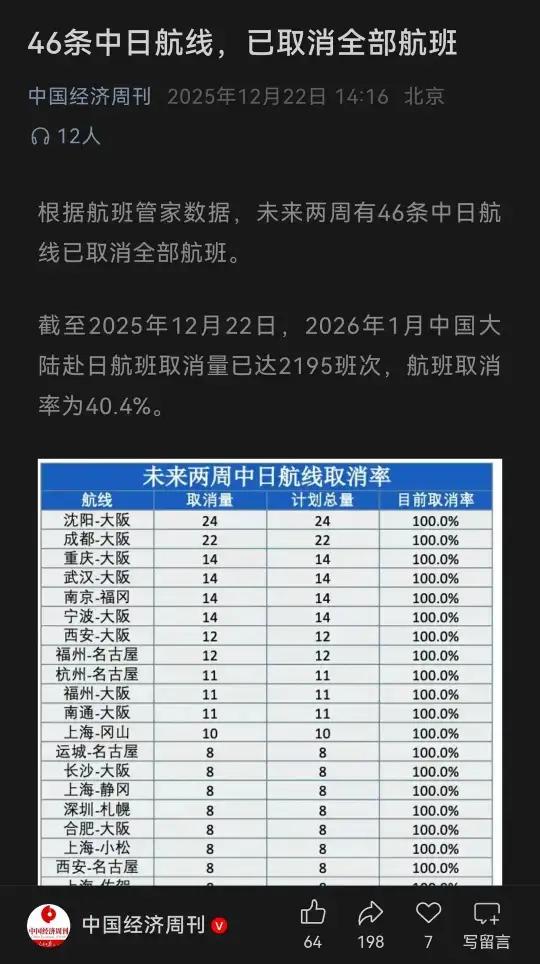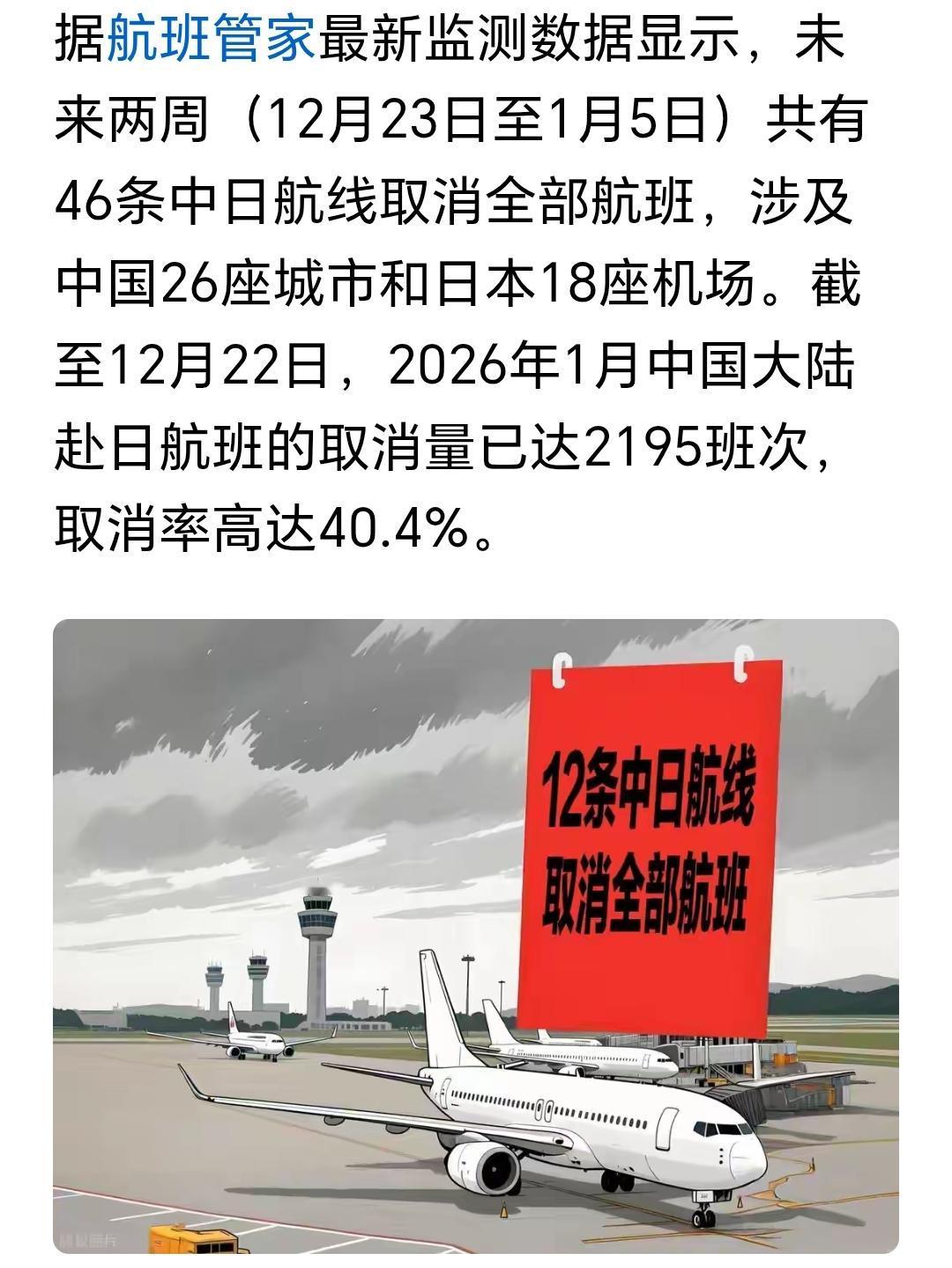不用你拒绝,因为我们压根就不想来了。46条中国-日本航线被取消,1月份航班取消率达40%。不仅是航班,邮轮也不去了。 这个新闻一出,然后就有很多为日本辩解的话在评论区出现了。 比如:现在日本满大街都是普通话,有钱人都在在外跑别人傻吗,某女明星才去日本滑雪,头条都是不想去小某书都是去了不想回来…… 要我说,只要是自己选择自己承担责任我觉得没毛病。 要问我,当然是君子不立危墙之下咯。 点右上角关注我,我们一起去看这个魔幻的世界
