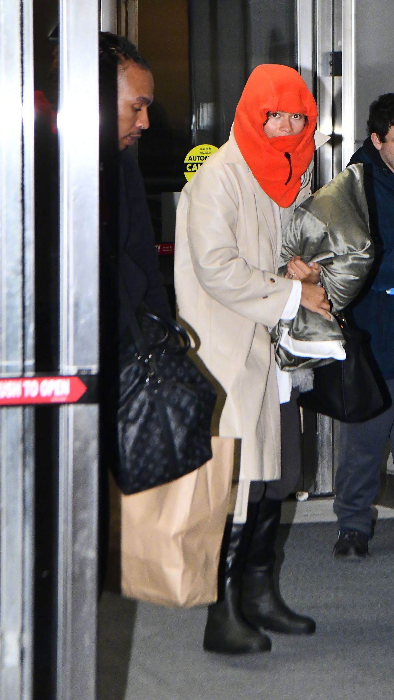现身肯尼迪机场的赞达亚,抱着自己的枕头。这亮橙色的兜帽直接把隐匿转化为引人注目的焦点。