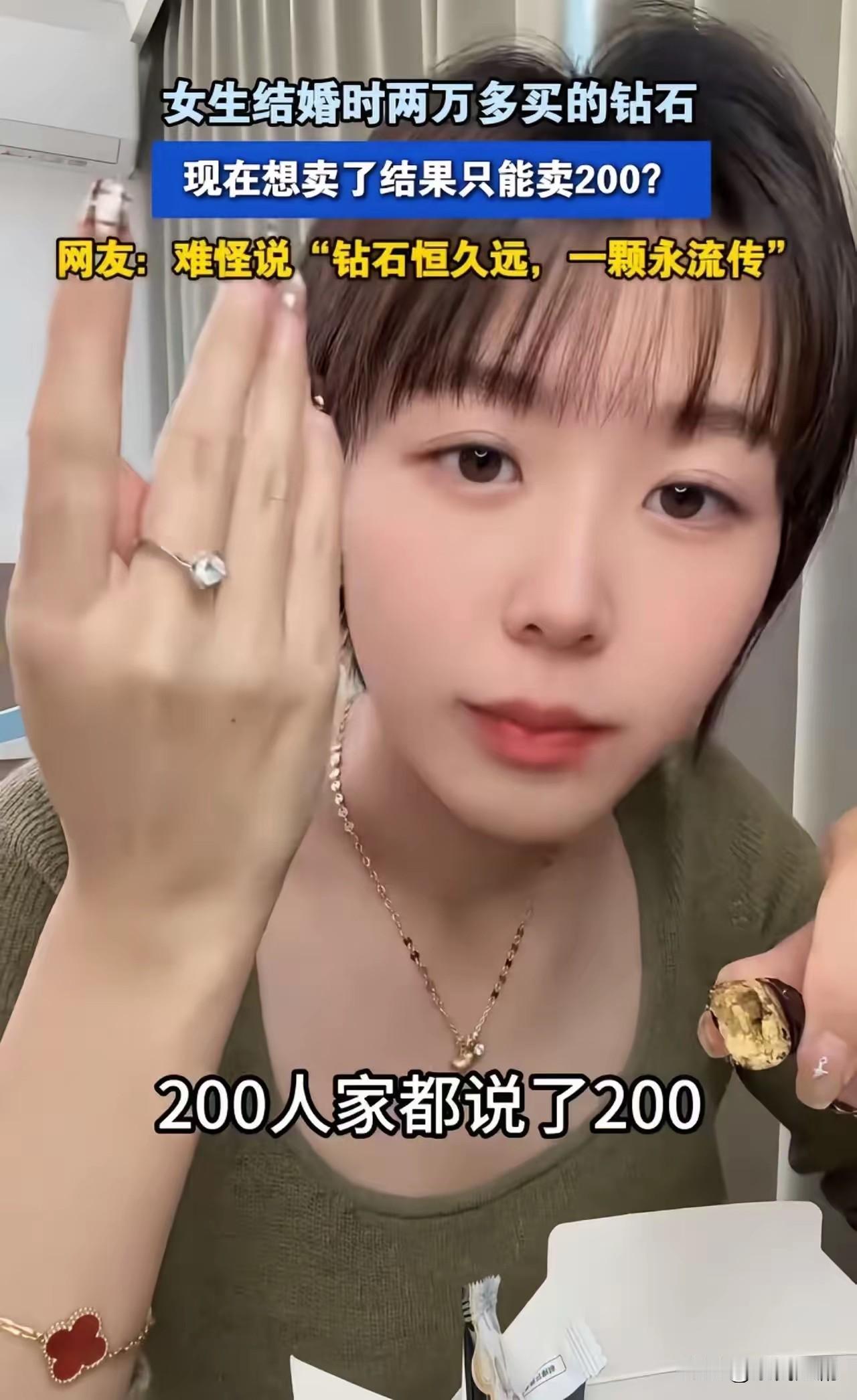 女子结婚时花费两万多元购置的钻石戒指,打算售卖时却仅换得200元的低价,如此巨大的反差令她感触颇深。她感慨道:“这回我算是明白了,人家卖钻石的时候都跟我说‘钻石恒久远,一颗永流传’,为啥能永流传?因为它卖不出去。”这句话既带着调侃意味,也体现出她对珠宝市场的深刻洞察。 钻石,向来是爱情的象征,被赋予了美好的寓意。然而,市场上钻石的价格却常常让人捉摸不透。不少消费者在购买时,受广告和品牌的影响,心甘情愿为一颗璀璨的石头付出高昂费用,但在需要变现时,却发现其实际价值远低于购买价格。这背后,是珠宝行业复杂的市场机制和品牌溢价在作祟。 女子的经历反映出一个普遍现象:钻石作为商品,其价值并非单纯由材质决定,而是受市场供需、品牌效应和营销策略的共同影响。许多钻石在购买时被包装成“永恒的爱”,可实际上,随着时间流逝和市场变动,其变现能力大幅降低。尤其是在二手市场,钻石价格往往只有原价的几成,甚至更低。 “钻石恒久远,一颗永流传”这句广告语,虽浪漫动人,却也揭示了行业的一种商业手段——通过塑造情感价值,推动消费者持续购买。实际上,钻石的“永恒”更多是市场营销的精心包装,并非绝对的价值保障。正如女子所言,很多人买了钻石,却在需要变现时困难重重,这也成了众多消费者心中的隐忧。 这件事提醒我们,购买珠宝时要保持理性。不要盲目追求品牌和高价,更要了解其真实价值和市场行情。对于已购买的钻石,也要理性看待其价值,不要盲目期待高额回报。更重要的是,作为消费者,要懂得维护自身权益,避免被虚假的“永恒”所蒙蔽。 总之,女子的经历反映出珠宝市场的复杂与现实,也提醒我们在追求美好象征的同时,更要理性消费、理性投资。毕竟,真正的价值,源于对商品的理性认知和合理判断,而非盲目的追捧和虚假的广告。