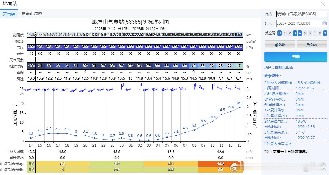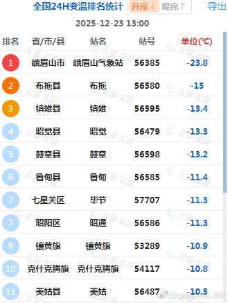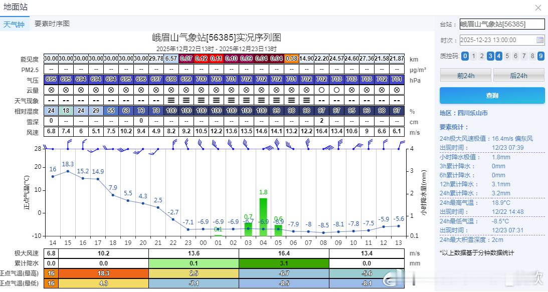 【降温】今天白天,内蒙古、青海、甘肃、四川、云南、贵州部分地区出现明显降温。四川峨眉山降23.8℃、云南镇雄降13.4℃、贵州赫章降13.2℃、内蒙古镶黄旗降10.9℃,为各自省区13时降温最强站点。峨眉山这个巨大的降温,因为冷暖平流以及日照变化。昨天在偏西风的暖气流推动下叠加光照加热(日照时数9.9小时),气温扶摇直上,最高18.9℃创了12月最高纪录;今天云雾遮挡光照,且在冷空气的北风影响下,气温大幅下滑。形成晴暖和阴冷的巨大反差。