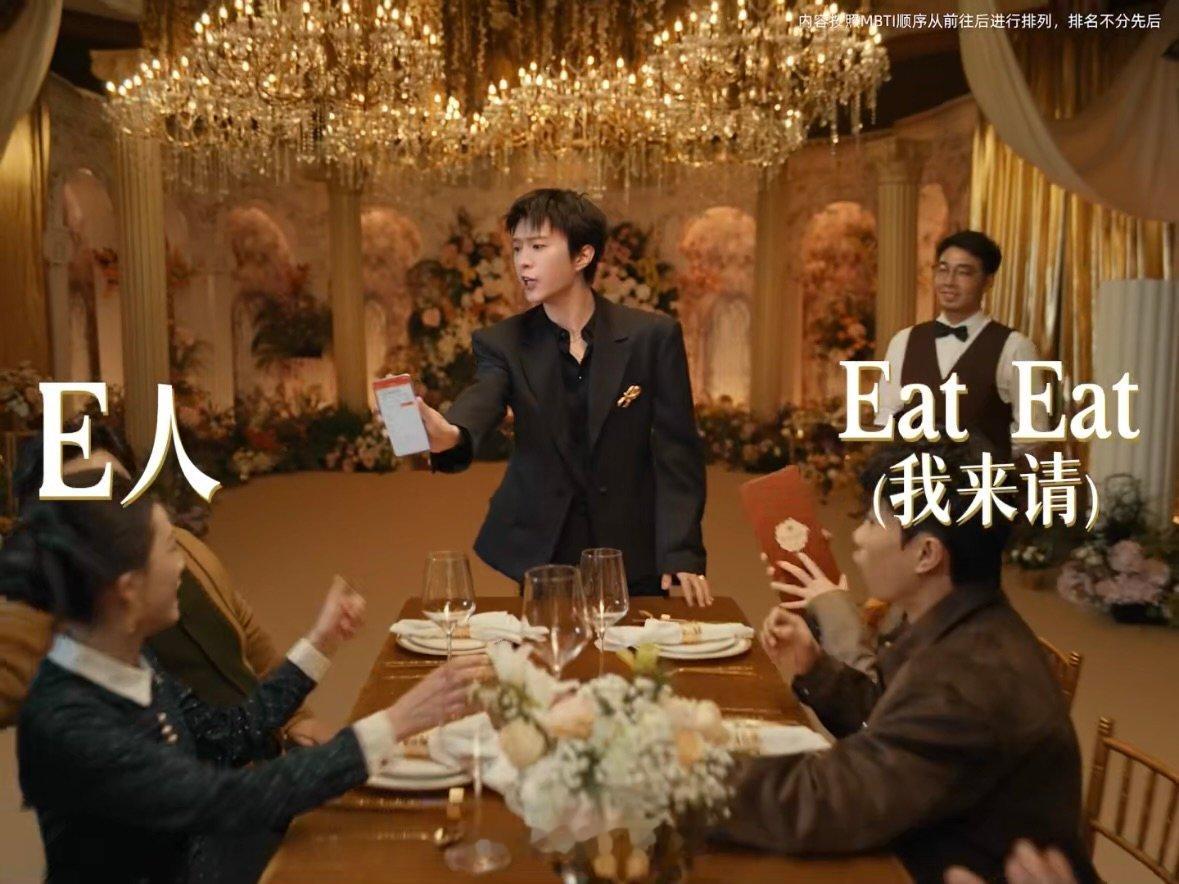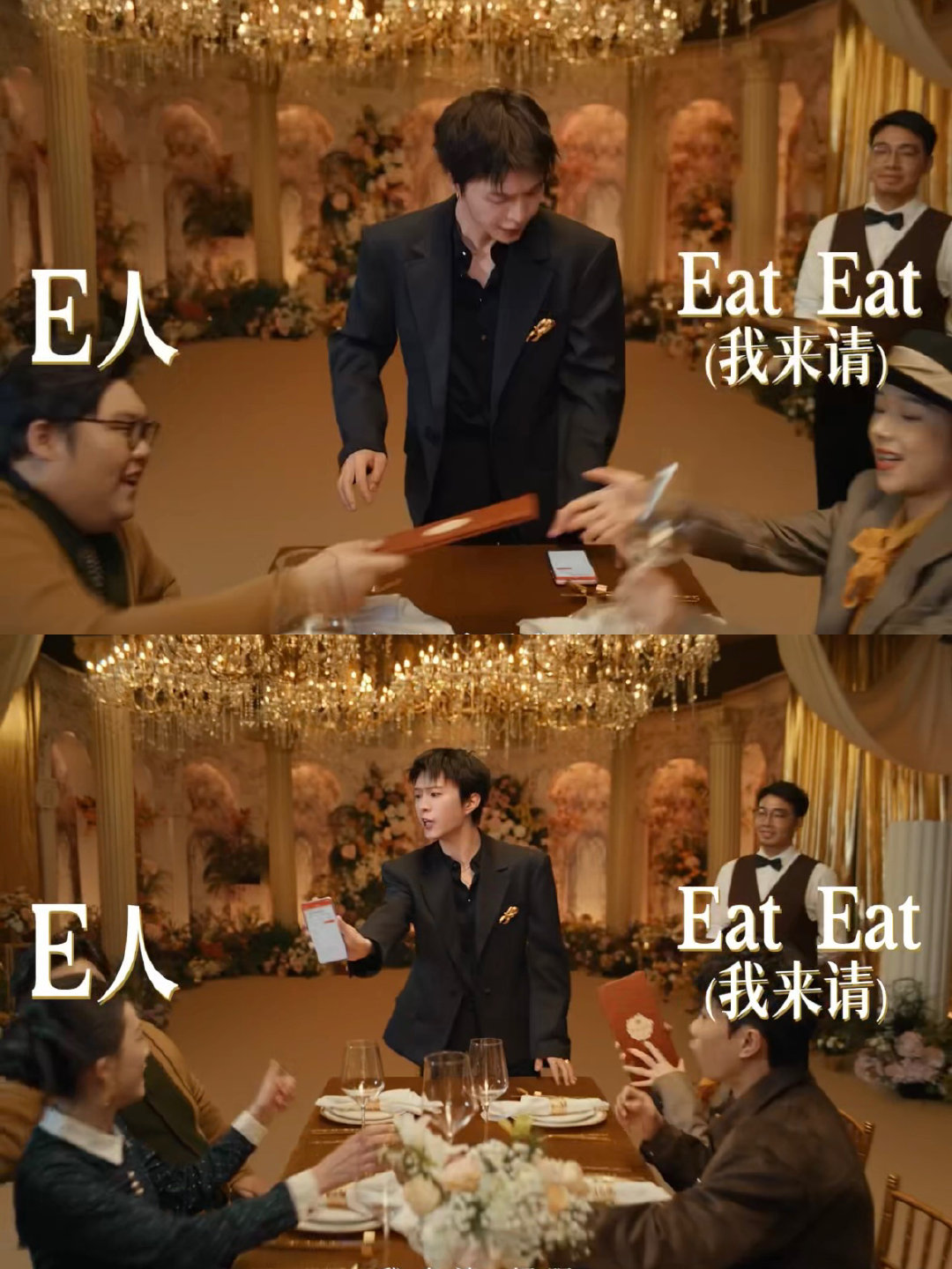 范丞丞演我E人攒钱 范丞丞演的就是E人拿到收益后的真实状态啊!餐厅点餐时收益到账,二话不说叫服务生、铺桌布凑成长桌宴,举着手机请客的样子超大气。“E人的E = Eat Eat 我请客的 E”,瞬间get到E人攒钱的快乐——独乐乐不如众乐乐!