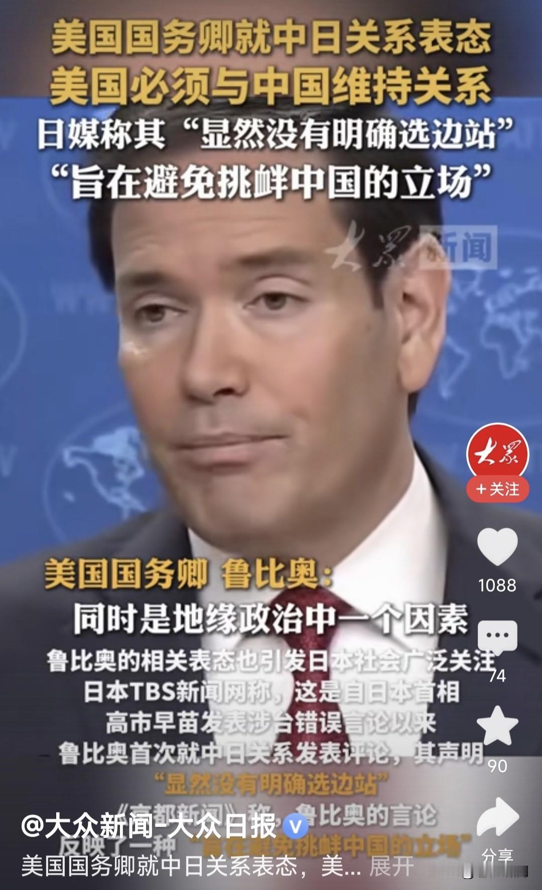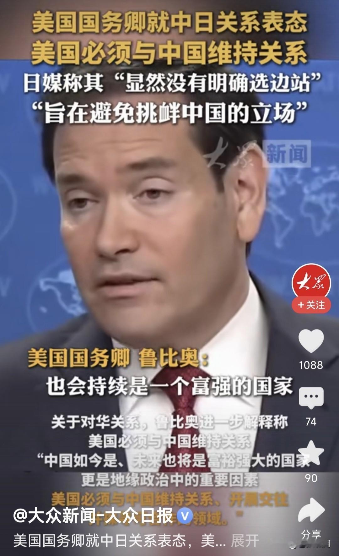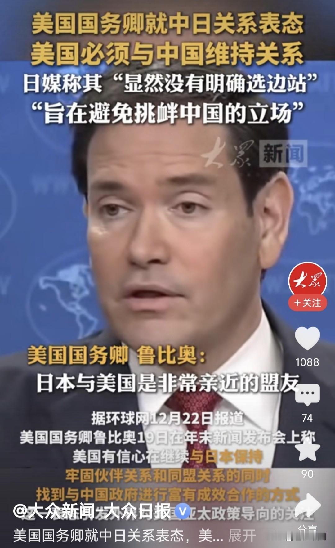 卢比奥突然“捧”中国,连沈逸教授都不适应了!此事源自国务卿年终新闻发布会,被问及中日“敏感问题”生争议,美国对此何态度时,卢比奥表态如下: 1.美国与中国关系不错!中国将会是一个富强国家,又是地缘政治重要因素,美国必须同中国维持合作关系。 2.美日韩是稳定同盟关系!美国会在不损害日韩利益的前提下,搞好同中国的关系,这样做符合美国的利益。 3.我过去对中国态度强硬,是工作岗位不同。现在是美国务卿,就得听命特朗普总统,这是本人的职责所在。 卢比奥以上表态,不仅沈逸教授吃惊,苍狼也有点吃惊!但仔细分析其说法,我们还是要留点心,灵活应对。 苍狼觉得卢比奥之言,有如下考量: 1.中国不是改开前的中国,老美已经奈何不得了!互斗互伤,合作才能共赢。尤其贸易战,对谁都没有好处。 2.这是川普政府国策,尤其明年中期选举,对老特与共和党很重要。搞好与中国关系,对稳定美国经济和世界格局关系重大,必须维持对中国关系。 3.与中国搞好关系,并不影响美日韩同盟关系,也不影响其对台湾与南海问题的立场。何况美国政府更迭,政策就会有改变。我们对此问题要清醒。 苍狼想起小平几句话:不管黑猫白猫,捉住老鼠就是好猫!发展才是硬道理!中国改革开放,是让人民过上好日子!无论世界风云如何变化,坚定按照小平指引的路往前走,一定不会错! …………