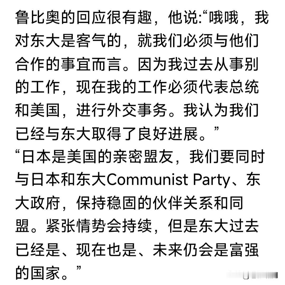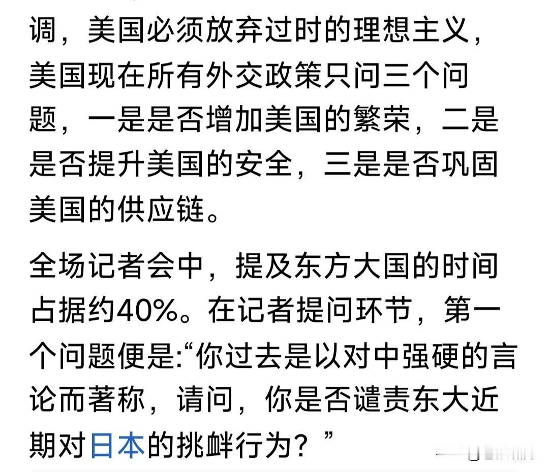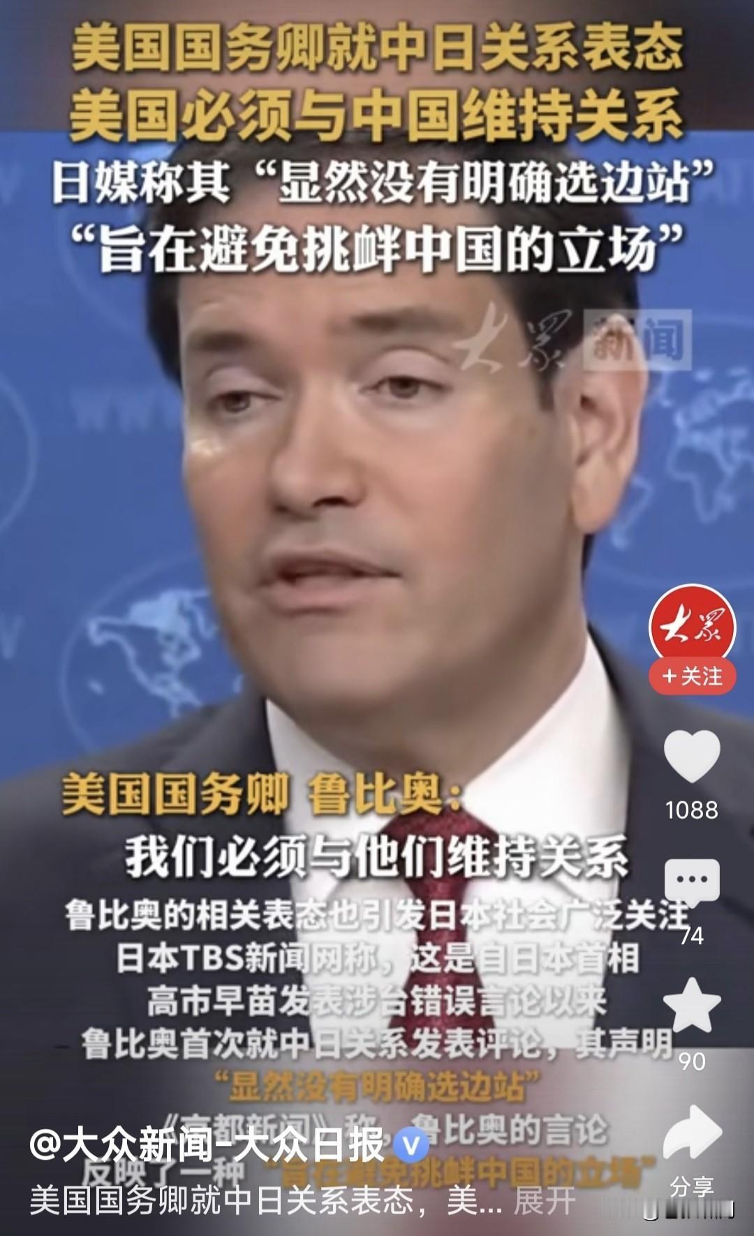 卢比奥突然“捧”中国,连沈逸教授都不适应了!此事源自国务卿年终新闻发布会,被问及中日“敏感问题”生争议,美国对此何态度时,卢比奥表态如下: 1.美国与中国关系不错!中国将会是一个富强国家,又是地缘政治重要因素,美国必须同中国维持合作关系。 2.美日韩是稳定同盟关系!美国会在不损害日韩利益的前提下,搞好同中国的关系,这样做符合美国的利益。 3.我过去对中国态度强硬,是工作岗位不同。现在是美国务卿,就得听命特朗普总统,这是本人的职责所在。 卢比奥以上表态,不仅沈逸教授吃惊,苍狼也有点吃惊!但仔细分析其说法,我们还是要留点心,灵活应对。 苍狼觉得卢比奥之言,有如下考量: 1.中国不是改开前的中国,老美已经奈何不得了!互斗互伤,合作才能共赢。尤其贸易战,对谁都没有好处。 2.这是川普政府国策,尤其明年中期选举,对老特与共和党很重要。搞好与中国关系,对稳定美国经济和世界格局关系重大,必须维持对中国关系。 3.与中国搞好关系,并不影响美日韩同盟关系,也不影响其对台湾与南海问题的立场。何况美国政府更迭,政策就会有改变。我们对此问题要清醒。 苍狼想起小平几句话:不管黑猫白猫,捉住老鼠就是好猫!发展才是硬道理!中国改革开放,是让人民过上好日子!无论世界风云如何变化,坚定按照小平指引的路往前走,一定不会错! …………