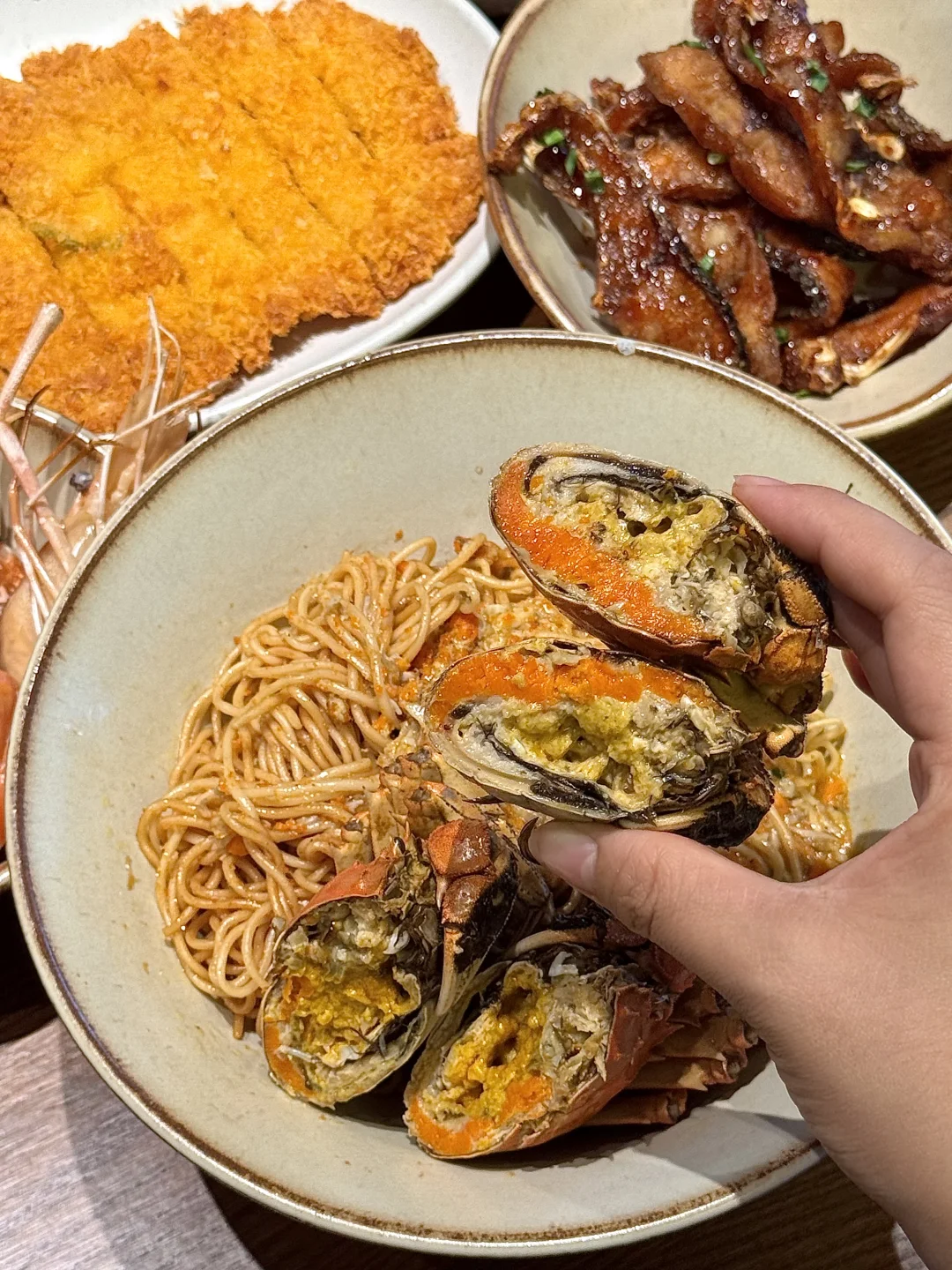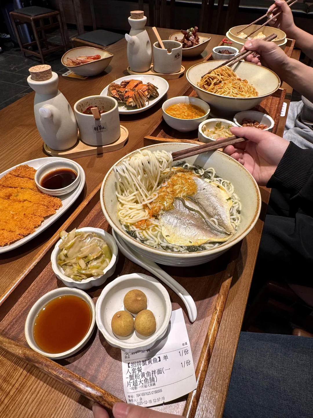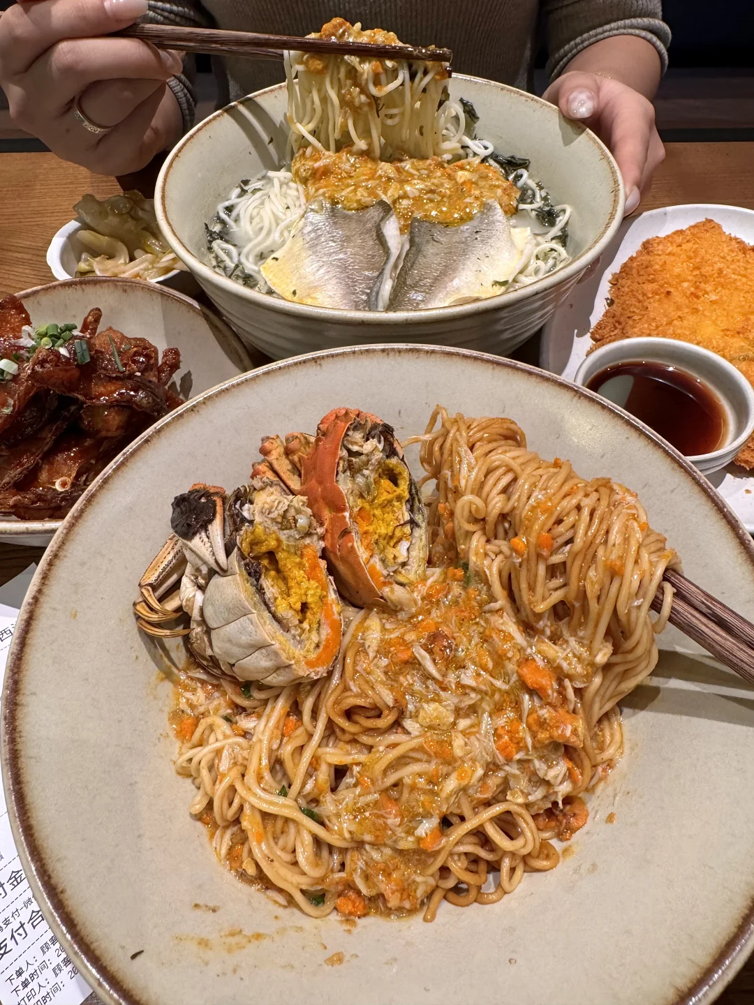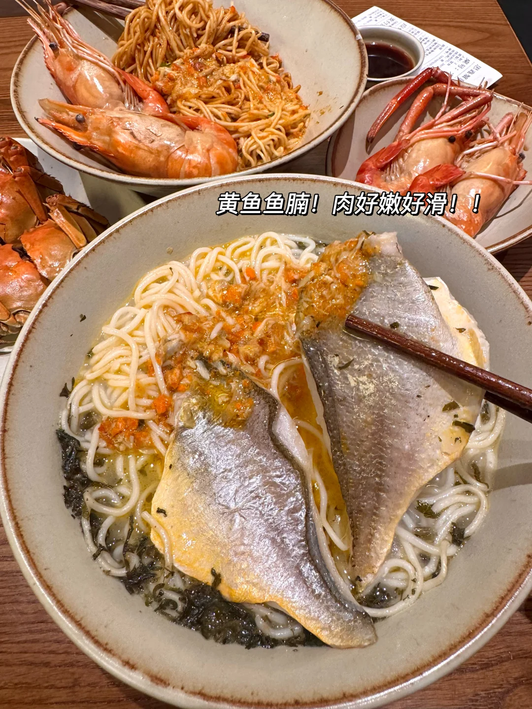 离西湖不远!!一家主做蟹黄黄鱼产品的朴素小店 饭点每次来都坐满。。 真的名不虚传!叫📍思鑫蟹黄鱼面馆)我们点了蟹粉鲜肉汤包,一口下去疯狂爆汁!蟹粉黄鱼煨面🍜黏黏糊糊的蟹黄金均匀裹在面条上 加上黄鱼腩一口下去鲜到掉眉真的惊艳! 还有蟹粉黄鱼炊饭 一饭三吃 汤泡饭巨巨巨鲜!!好适合跟朋友2-3人分着吃!各种小吃 黄金蛋汁炸猪排、现炸酥鱼、花雕熟醉虾😭好吃到全部光盘…… 感谢本地人推荐🙏
