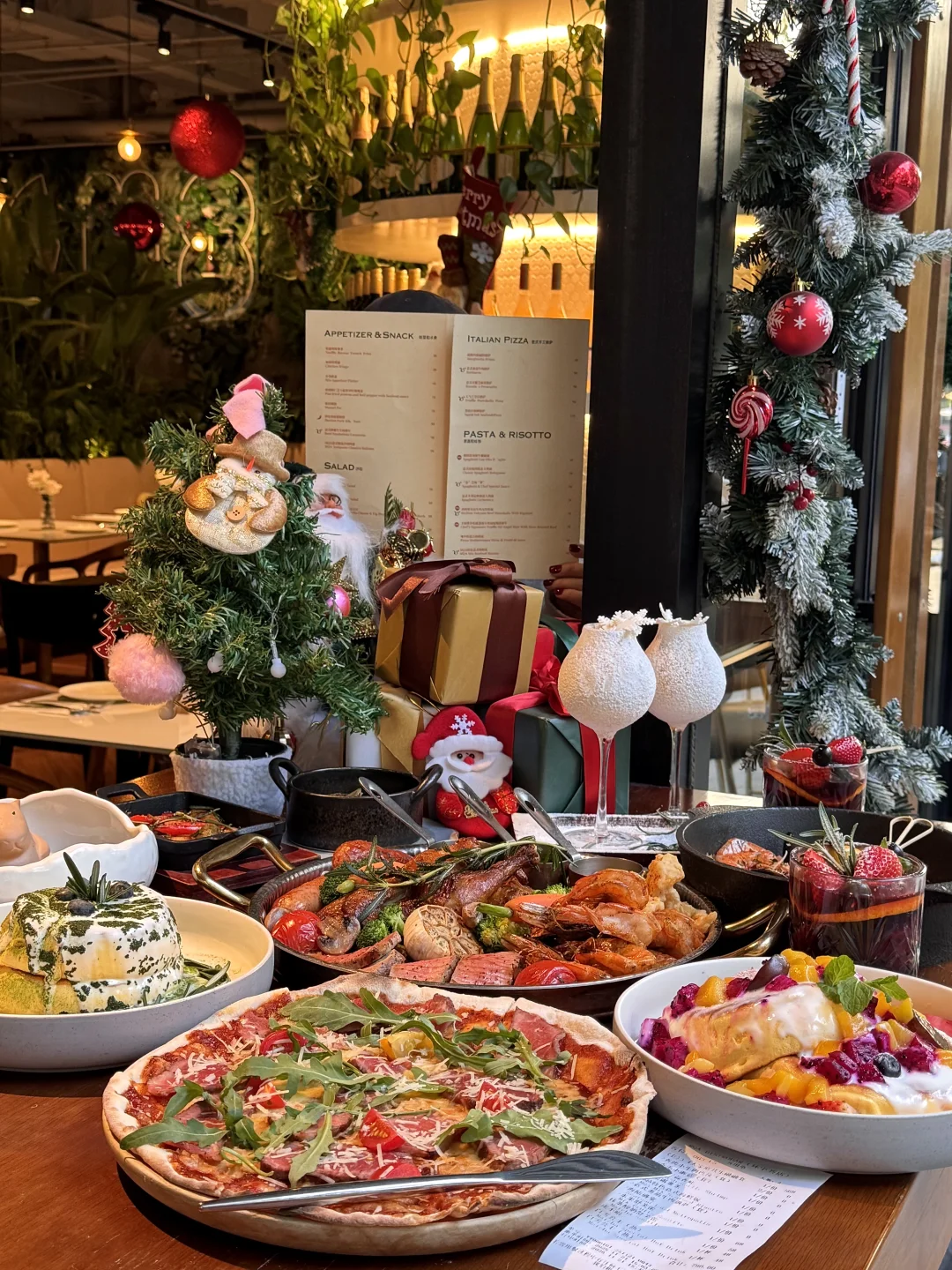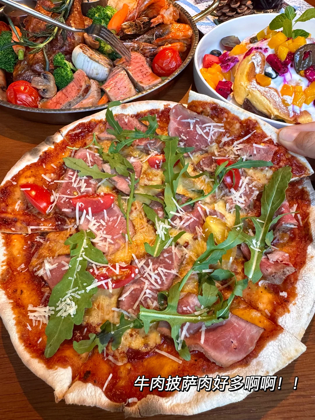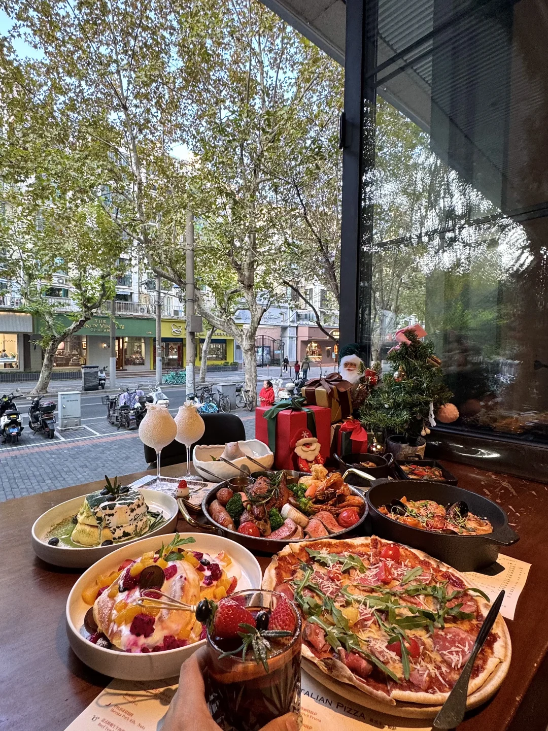 上海新天地!!不宣传这个你糊涂啊!!!! 我心中可以排前三的brunch餐厅!!就在马当路!!(叫MQA)店里好chill!临街大窗就像一幅壁画…不管是约会还是分手都很合适! · 这个意式番茄牛肉披萨 现点现做一上桌就肉香扑鼻 真的不要太好吃了…海陆盛宴 烤鸡、烤虾、鳕鱼、牛肉…料好多好丰富!还喝到了冬天的第一杯圣诞热红酒🍷水果舒芙蕾、意式海鲜饭…全都精致又好吃!!