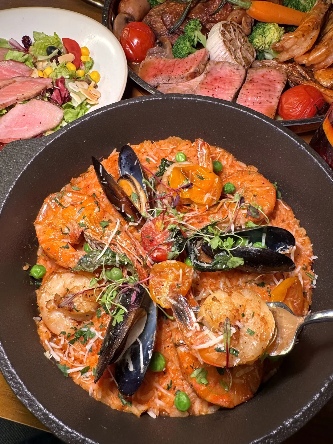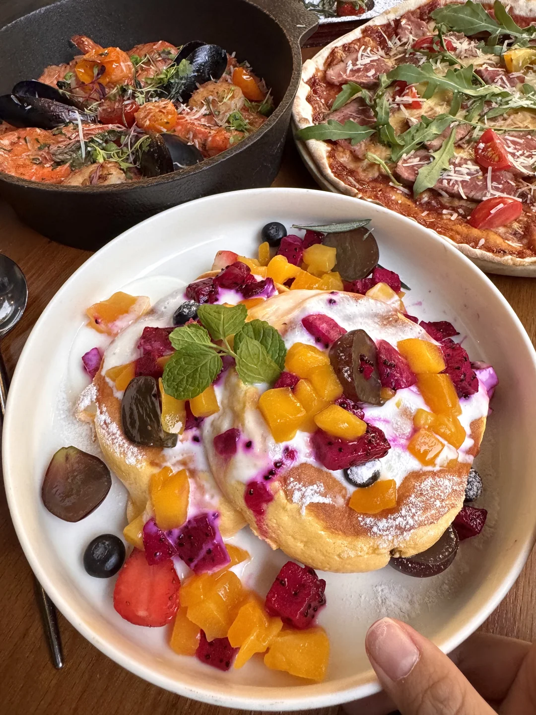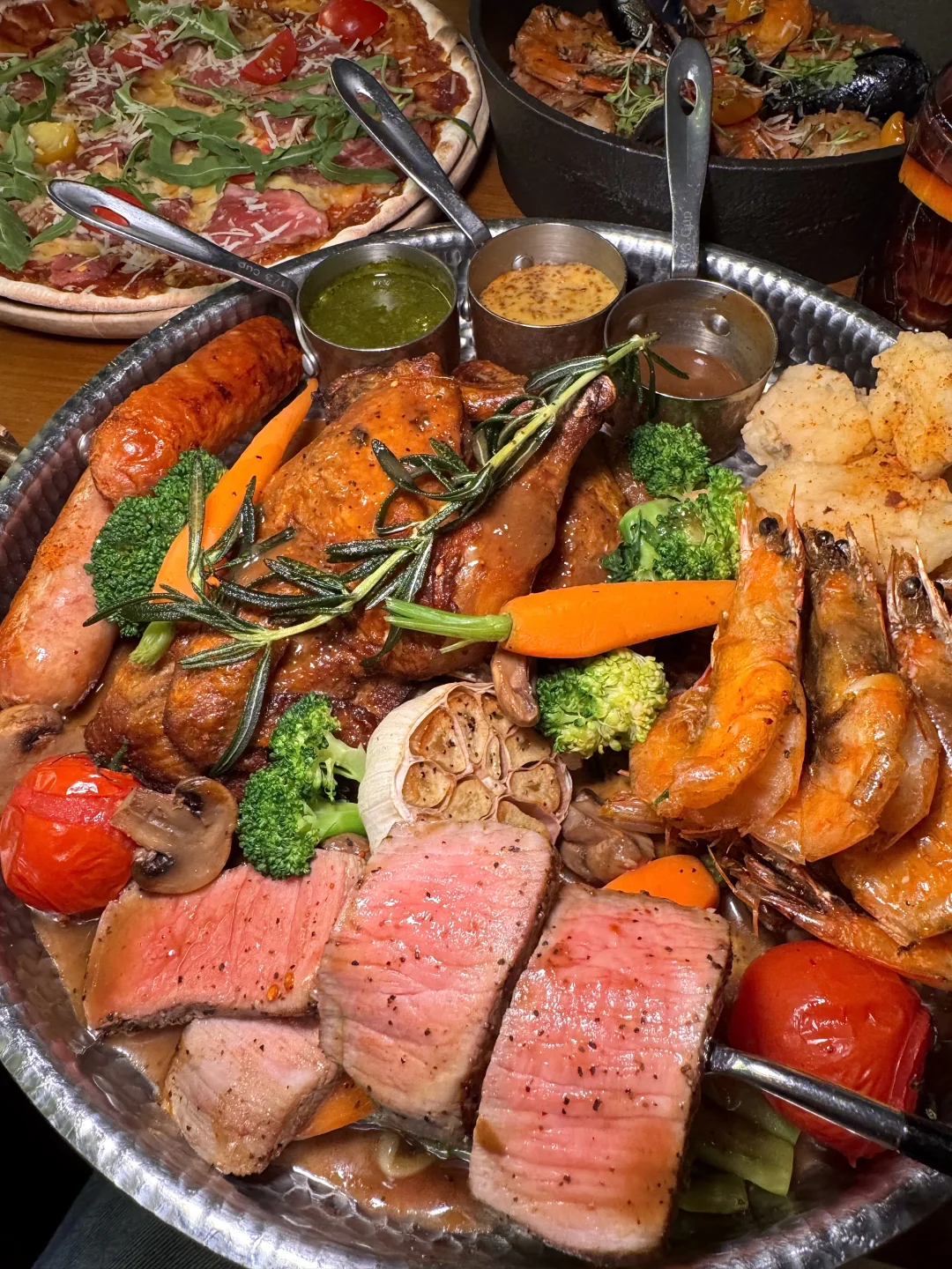 上海新天地!!不宣传这个你糊涂啊!!!! 我心中可以排前三的brunch餐厅!!就在马当路!!(叫MQA)店里好chill!临街大窗就像一幅壁画…不管是约会还是分手都很合适! · 这个意式番茄牛肉披萨 现点现做一上桌就肉香扑鼻 真的不要太好吃了…海陆盛宴 烤鸡、烤虾、鳕鱼、牛肉…料好多好丰富!还喝到了冬天的第一杯圣诞热红酒🍷水果舒芙蕾、意式海鲜饭…全都精致又好吃!!