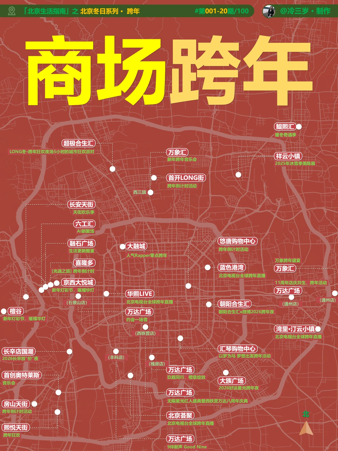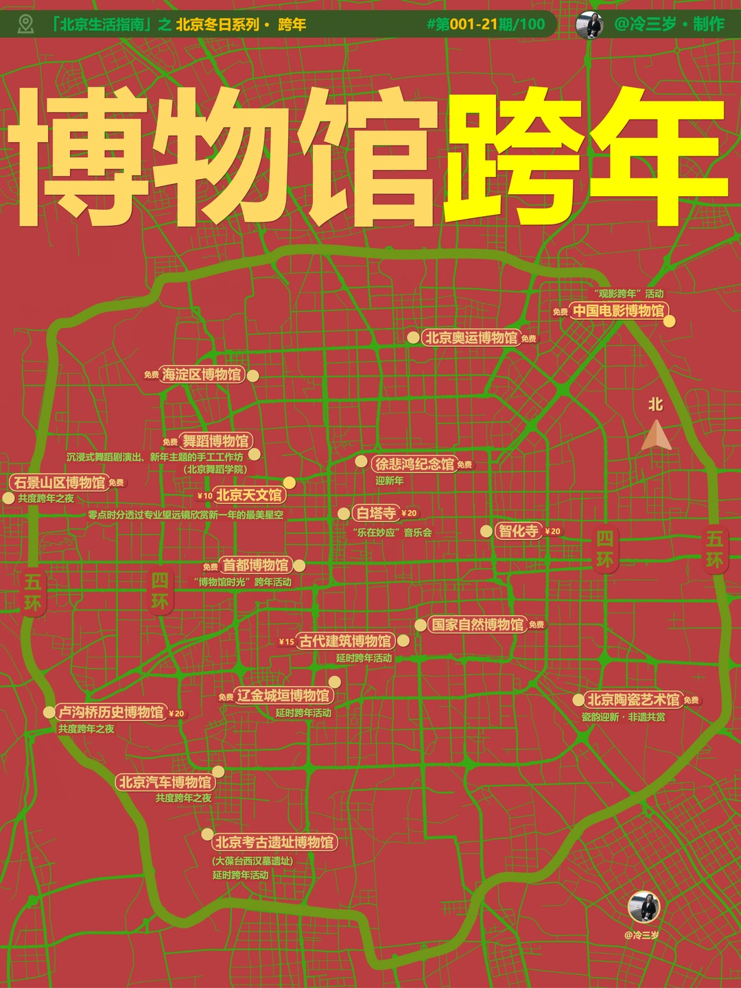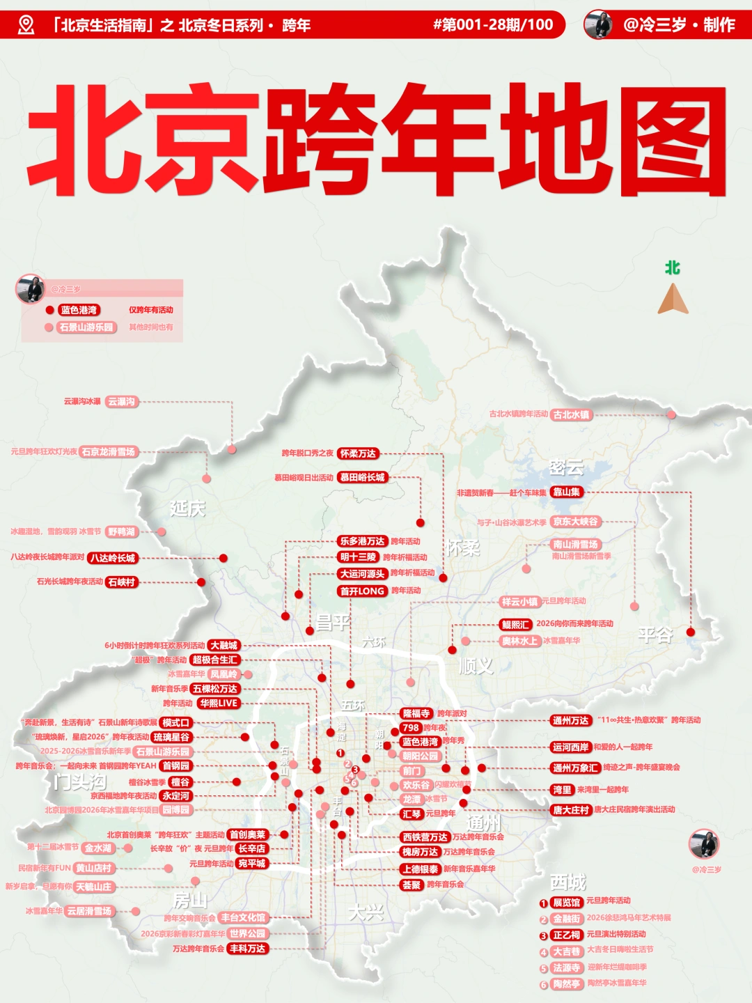 11月赏秋结束之后 我就开始准备北京冬日游玩攻略 (北京的秋天太短了) [失望R]严格来说,算是搞定了80%吧 还有部分在收尾 先汇总发出来,方便大家查找参考 主要包括: [拔草R][拔草R]一、冰雪相关 [打卡R]图2:北京冰场地图 (北京又暖冬,不知道颐和园/后海是否还能开了 [打卡R]图3:北京冰瀑地图 (部分有了,可以冲了,天仙瀑一直想去 [打卡R]图4:北京滑雪场地图 (都已经开板了,也可以冲了) [打卡R]图5:北京雪景地图 (北京下雪了,这些地方好看,除了故宫还有不少 [拔草R][拔草R]二、北京跨年 [打卡R]图6:北京跨年地图 [打卡R]图7:北京商场跨年地图 [打卡R]图8:北京博物馆跨年地图 (另外还有一份表格文档,是演唱会,话剧,音乐剧,livehouse的,免费公开的) (我定了人民大会堂的跨年音乐会,同时我还想去乌兰布统雪地穿越[笑哭R]) [拔草R][拔草R]三、北京圣诞节 [打卡R]图09:北京圣诞氛围地图 [打卡R]图10:北京圣诞地图(东三环) [打卡R]图11:北京圣诞路线(王府井) [打卡R]图12:北京圣诞集市地图(不过很多过时效了 [拔草R][拔草R]四、北京泡汤(汤泉/私汤/温泉) [打卡R]图13:北京汤泉地图 [打卡R]图14:北京私汤地图 [打卡R]图15:北京温泉地图 [打卡R]图16:北京温泉酒店地图 (北京跨年,汤泉也是很多人的选择,去年爆满,我提前半个月定了汤泉,以及电竞房。后来改成私汤民宿,组了个20人的局) -----以下的,还在收尾中------ [打卡R]图17:北京书店地图 [打卡R]图18:北京商场地图 备注: [打卡R]1.博物馆完结了,刚单独发出来了 [打卡R]2.书店,商场还在更新中,想by区分享出来 [打卡R]3.还有北京的寺庙,我还在整理中 [打卡R]4.北京1000+个公园,之前已经发过 PS.这些内容都已经更新到「北京游玩攻略」文档里了 已经拿下过的,可以自取高清原版 大家还想看哪些领域的,和我说呀