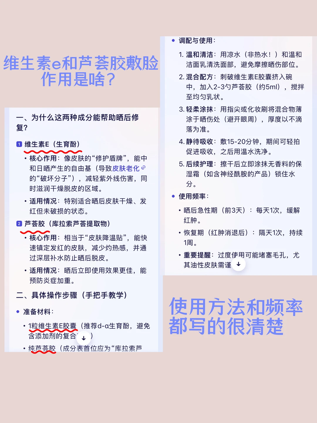 ✨甚至解释了维生素e和芦荟胶敷脸有什么作用——一个修复屏障,一个降温退红,搭配效果1+1>2!