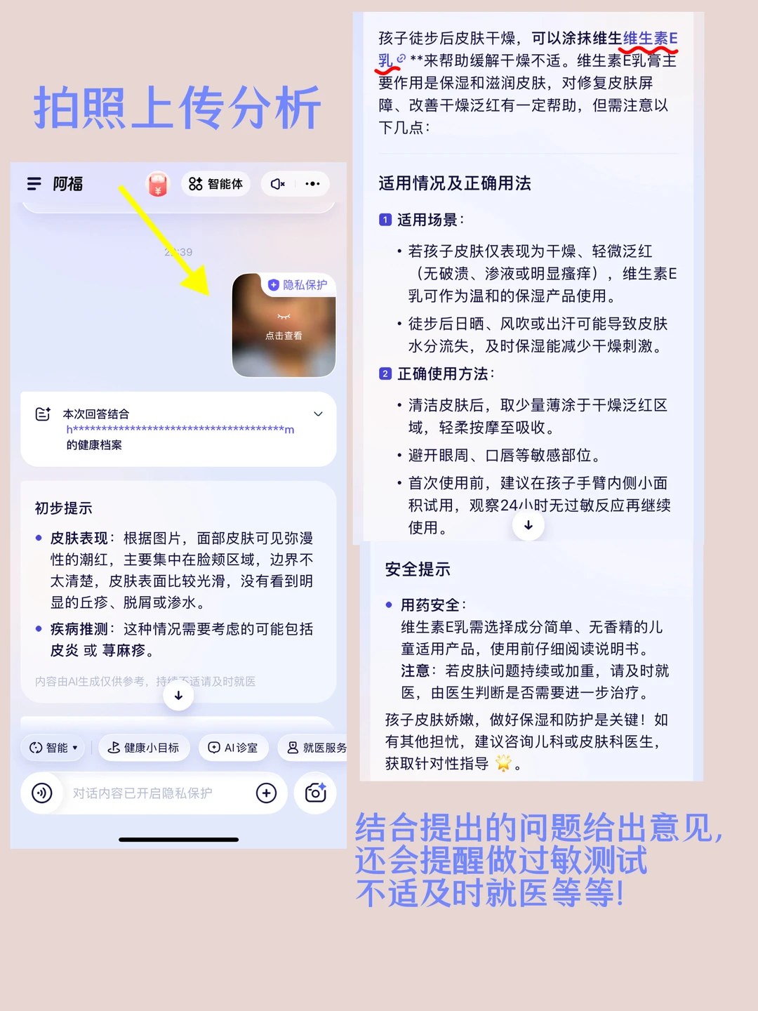 ✨急得我赶紧掏出阿福,用「拍皮肤」功能对准老公的脸咔嚓一张—— 阿福立马识别出轻度晒伤,不仅提醒“维生素e乳+芦荟胶敷脸可舒缓”,还主动追问有没有脱皮、刺痛等症状! (追问细节戳中我!像极了医生问诊时的耐心❤️)