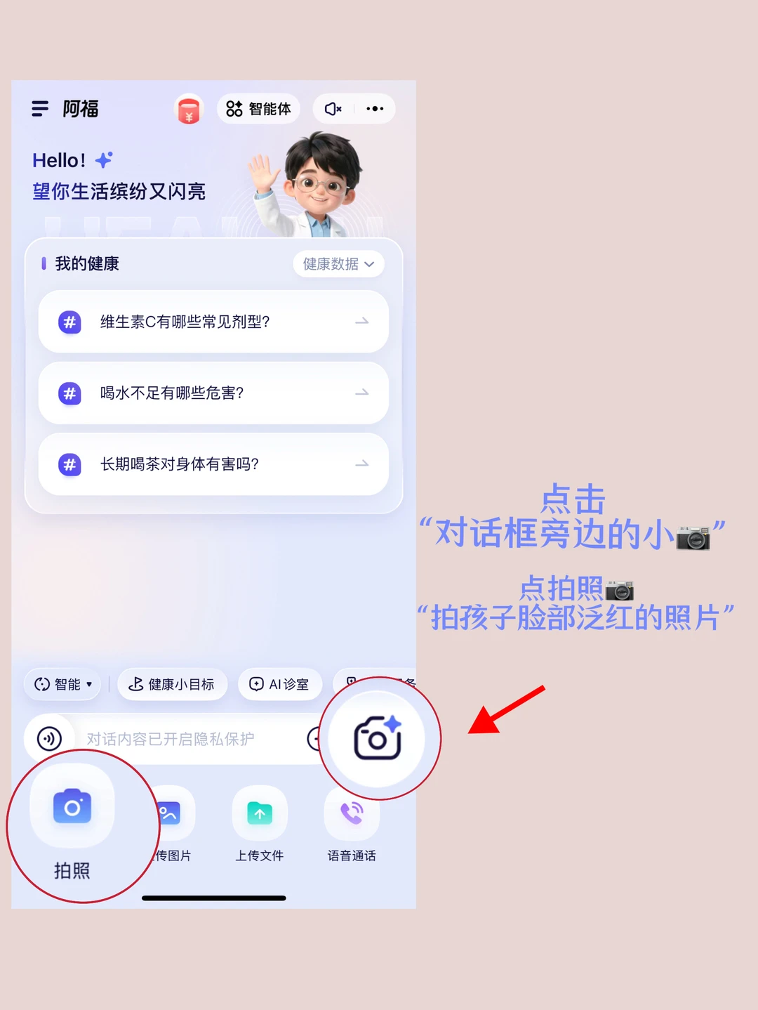 ✨真实使用细节: 阿福的「拍皮肤」功能连脸颊的毛孔细节都分析得明明白白,追问时还弹出皮肤护理小贴士,真的像多了个AI儿科朋友!