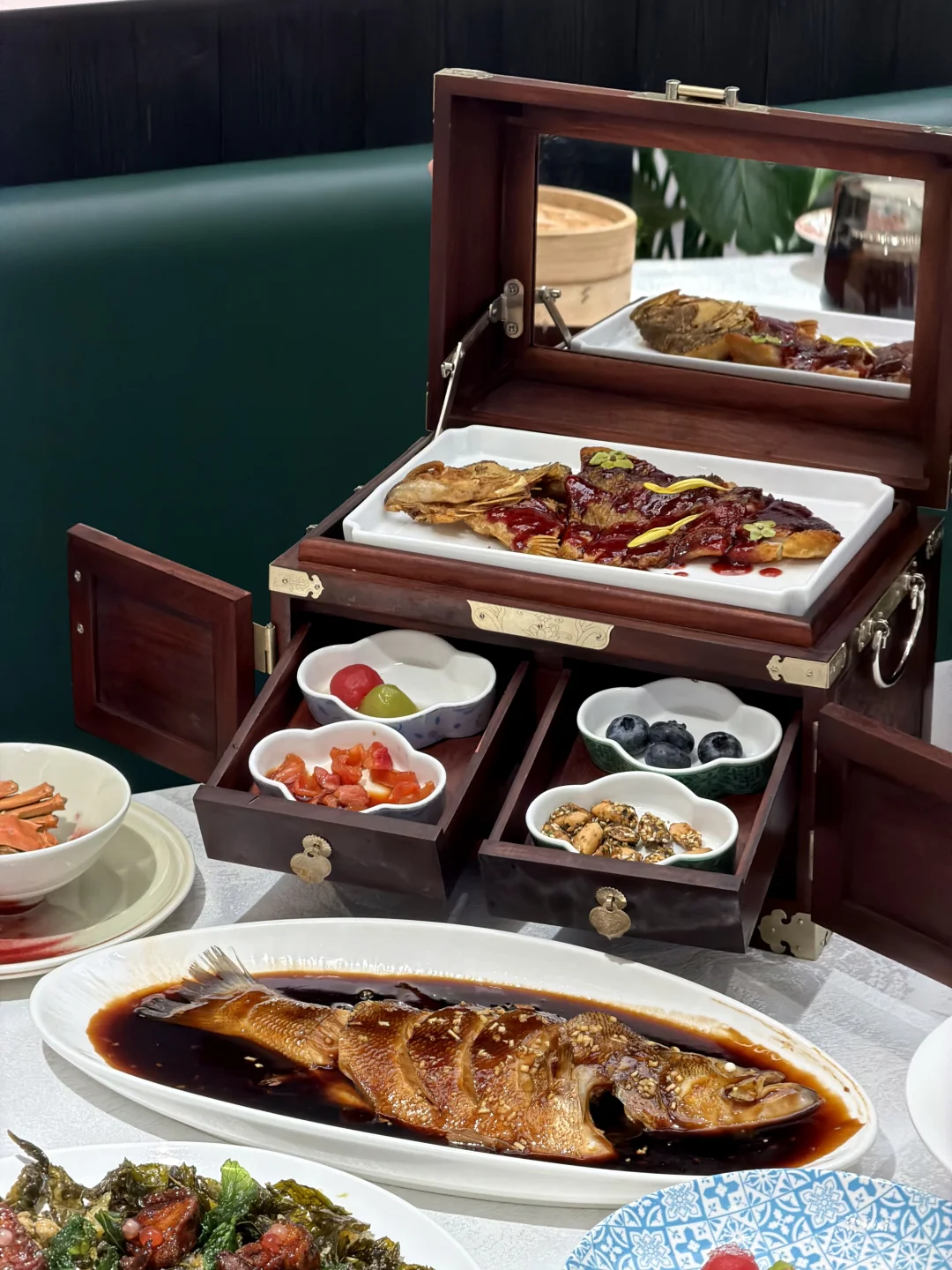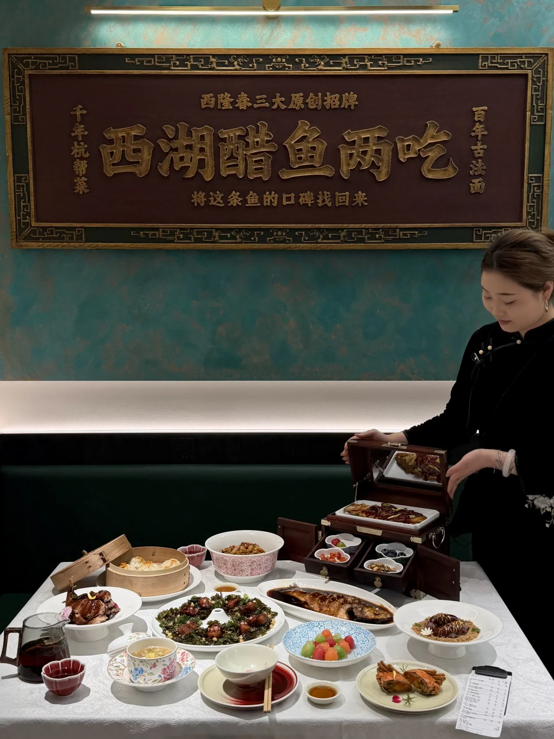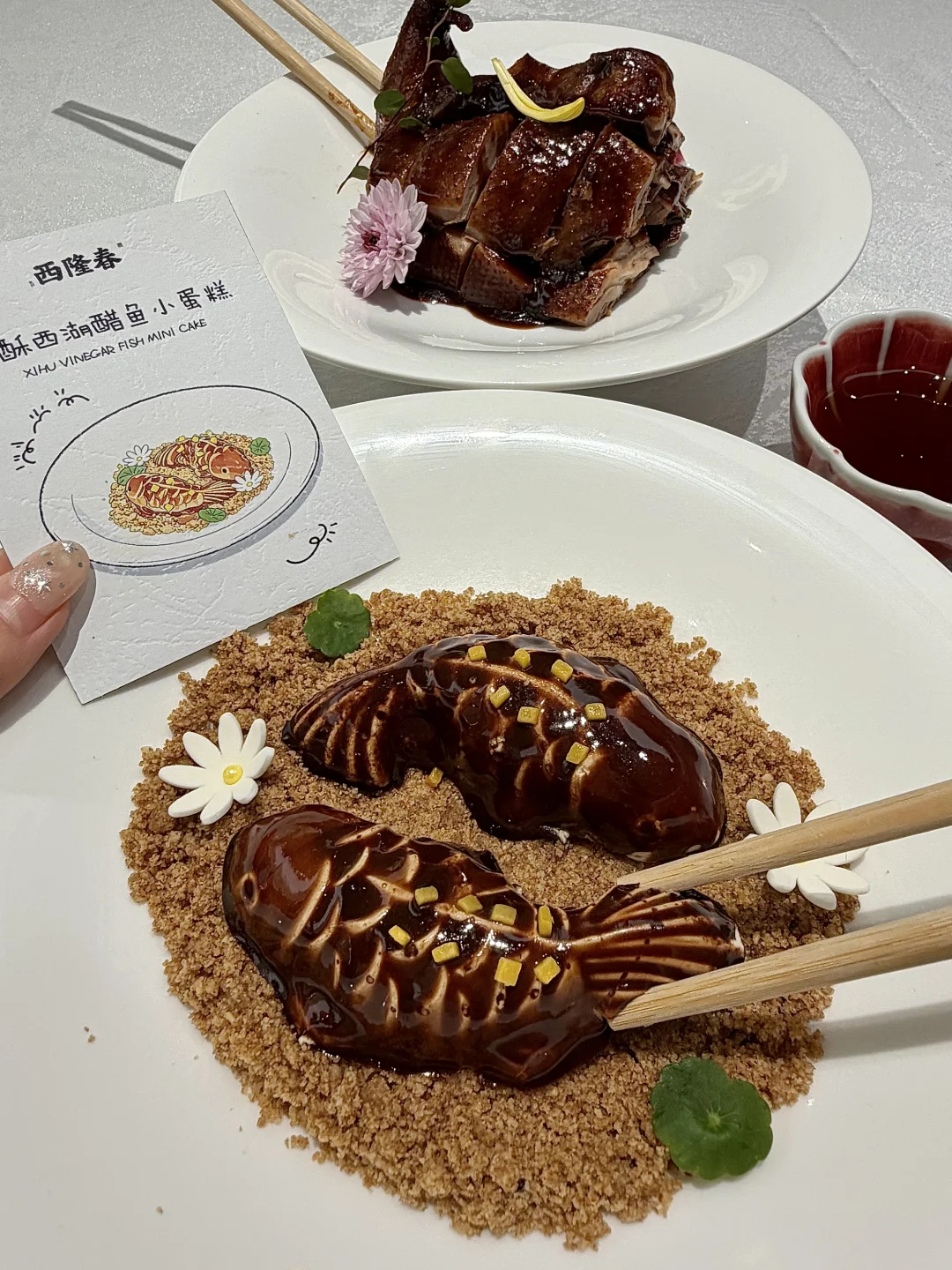 就在西湖边!本地朋友带我们去吃的😭 - ✔️月光宝盒西湖醋鱼两吃 还是第一次吃西湖醋鱼🐟酸酸甜甜比想象中好吃很多!! ✔️虾仁腰花拌川 过油现炒的拌川锅气满满🍜嗦得停不下来!!! ✔️手工蟹黄小笼包 蟹黄小笼包一口爆汁💥淋上蟹醋完全不腻!! ✔️金酥西湖醋鱼小蛋糕 西湖醋鱼形状的小蛋糕!也太逼真了🥹