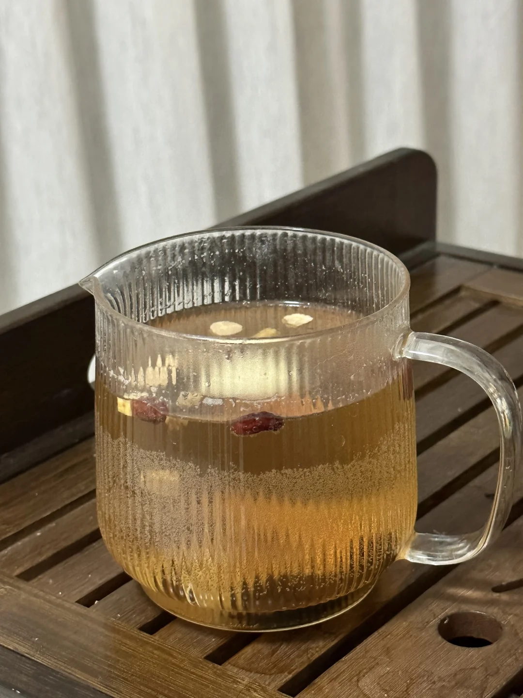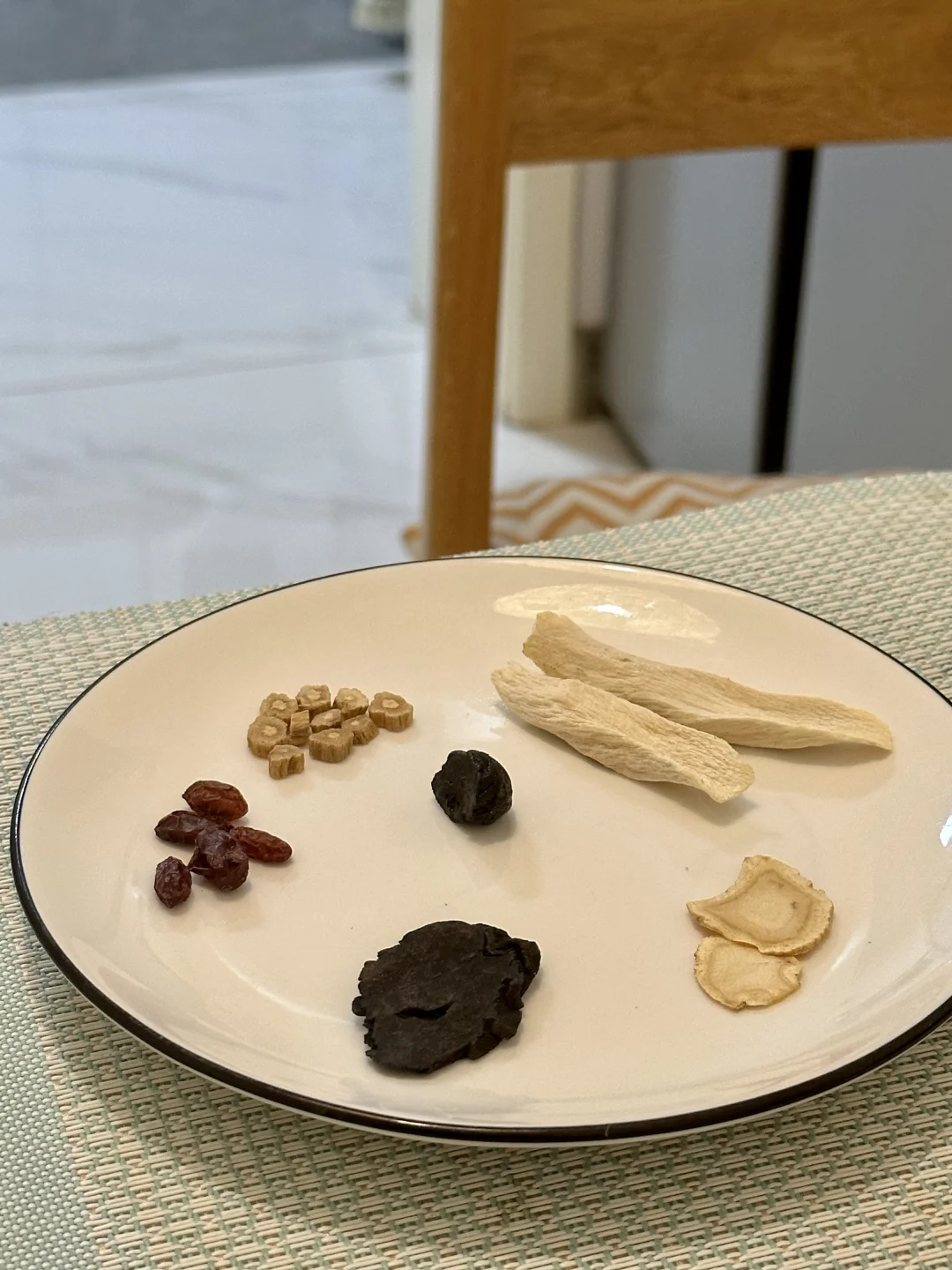 我给起名叫做“温益元阳汤”:山茱萸5粒、熟地黄4分之1、怀山药3片、党参10粒、西洋参2片、陈皮一小瓣、肉苁蓉1片,上午提前将食材浸泡(除了山茱萸),下午将浸泡好的食材煮开焖泡30分钟,水温晾至80度以下,加入山茱萸即可,隔一天喝2杯,较佳饮用时间在下午1点到5点半之前。