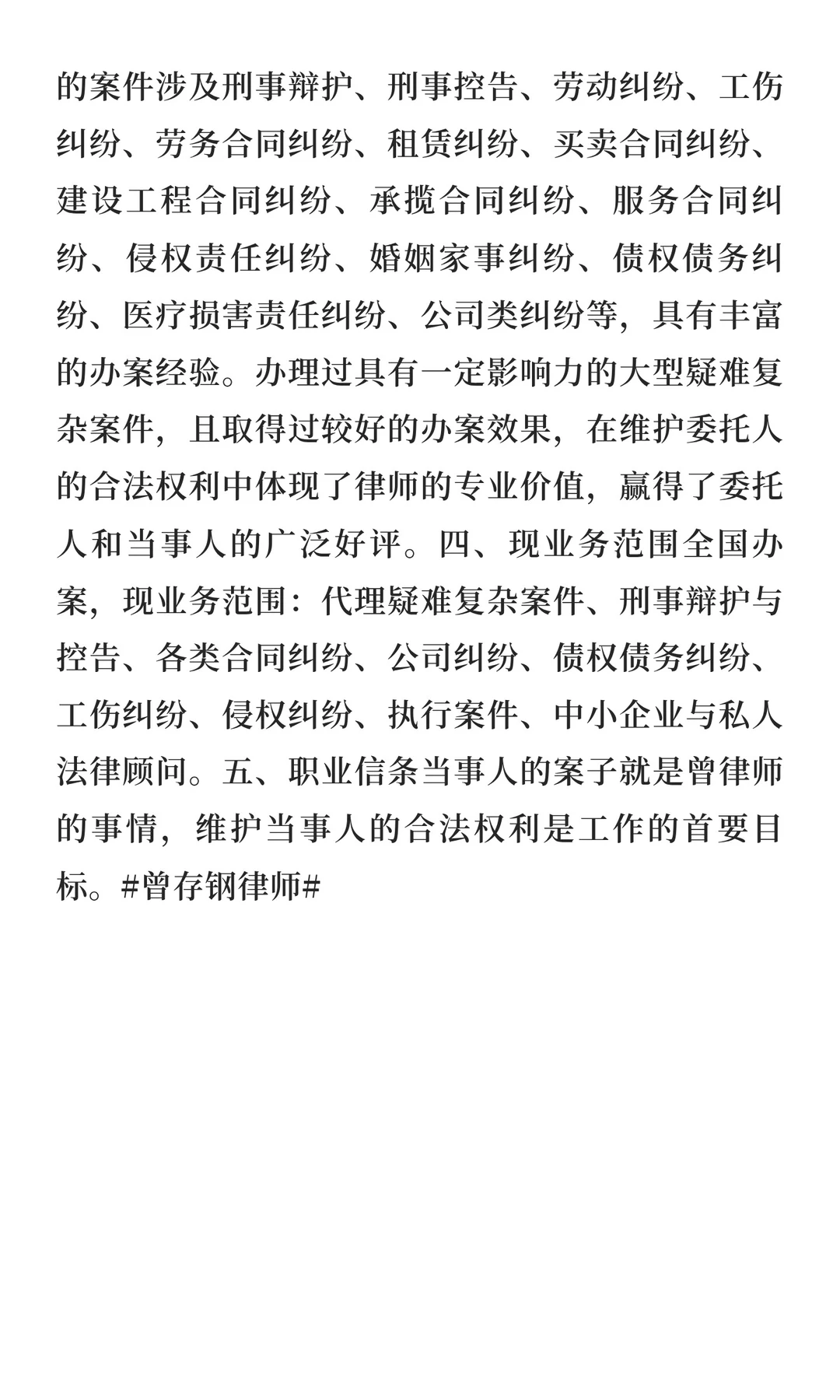 全国办案律师曾存钢(简版)一、个人基本情况曾存钢,深圳律师,1988年生,湖南人,硕士学历,本科在湖南科技学院学习,研究生在西南政法大学学习,刑法学硕士。2016年获得法律职业资格证,有较为丰富的法律实务经验。喜欢通过网络形式进行普法宣传,意在通过律师普法,让更多普通群众知法懂法守法用法,学会用法律途径维护自身合法权利。在全网拥有粉丝30多万。主要客户为中小企业和普通群众。二、工作经历2018年7月—2020年4月实习律师、律师助理,2020年8月执律师,现执业于广东普罗米修(福田)律师事务所,执业证号14403202010224658。三、办案经验自2018年12月以来,参与办理诉讼和非诉案件500多宗。办理的案件涉及刑事辩护、刑事控告、劳动纠纷、工伤纠纷、劳务合同纠纷、租赁纠纷、买卖合同纠纷、建设工程合同纠纷、承揽合同纠纷、服务合同纠纷、侵权责任纠纷、婚姻家事纠纷、债权债务纠纷、医疗损害责任纠纷、公司类纠纷等,具有丰富的办案经验。办理过具有一定影响力的大型疑难复杂案件,且取得过较好的办案效果,在维护委托人的合法权利中体现了律师的专业价值,赢得了委托人和当事人的广泛好评。四、现业务范围全国办案,现业务范围:代理疑难复杂案件、刑事辩护与控告、各类合同纠纷、公司纠纷、债权债务纠纷、工伤纠纷、侵权纠纷、执行案件、中小企业与私人法律顾问。五、职业信条当事人的案子就是曾律师的事情,维护当事人的合法权利是工作的首要目标。