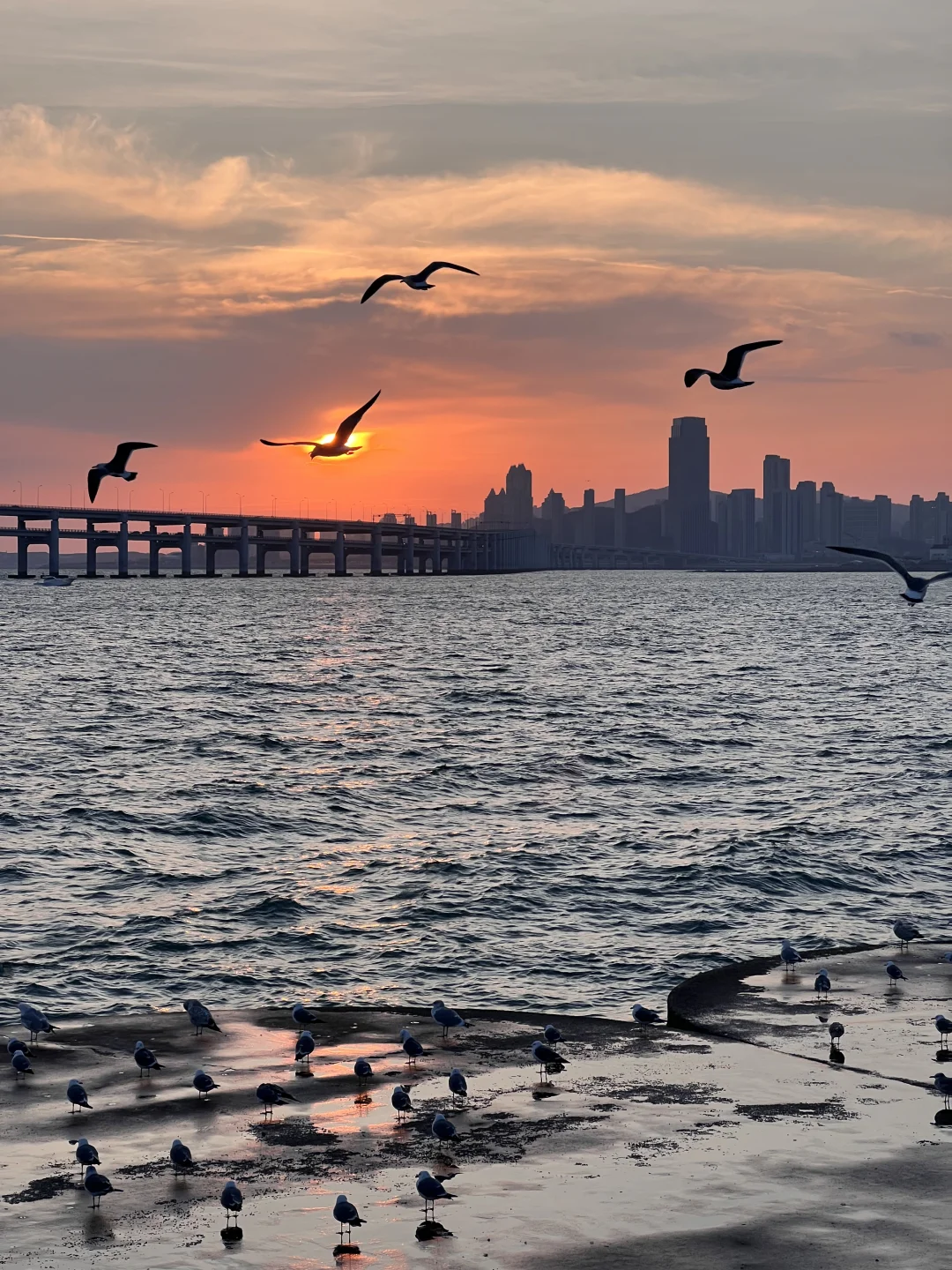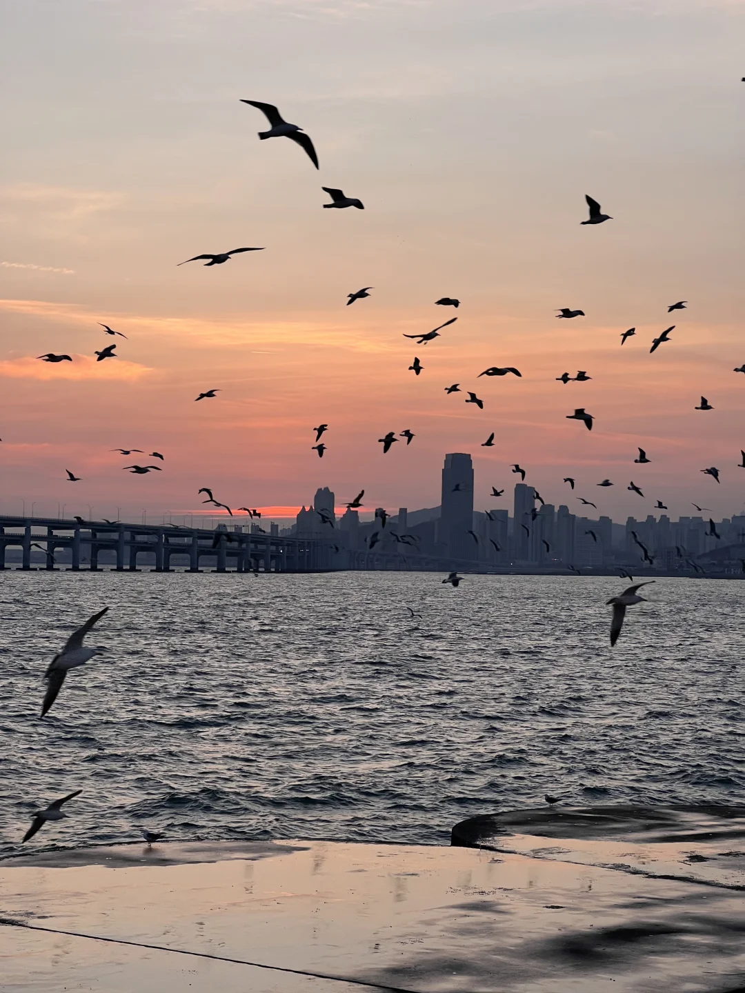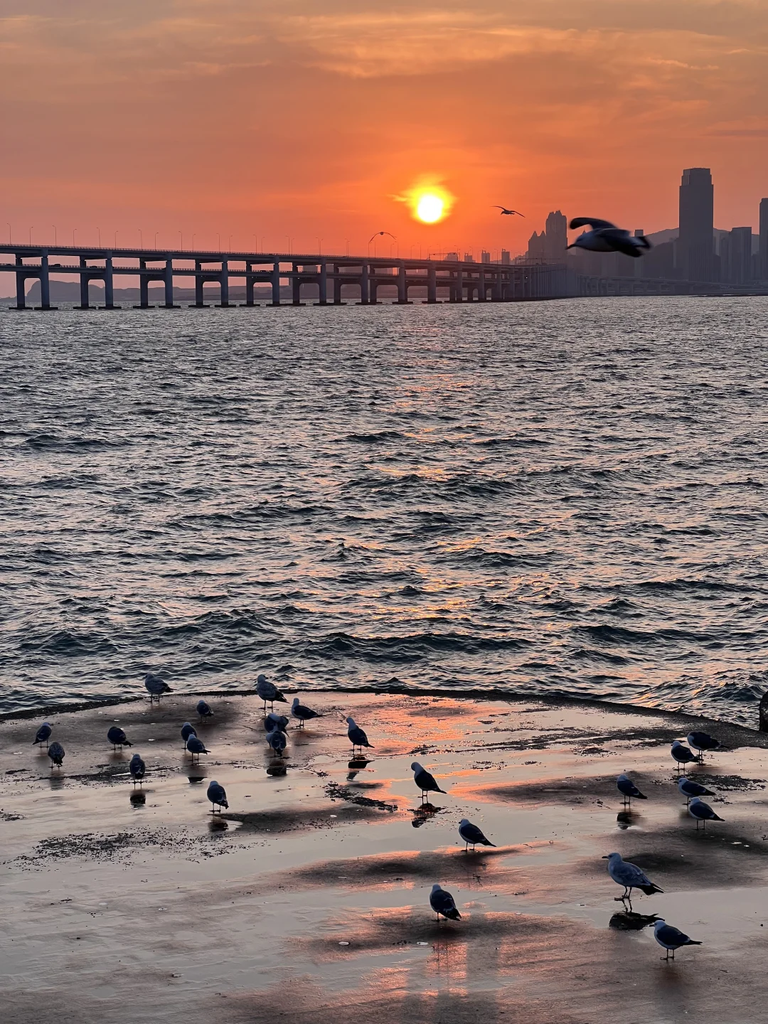 🚶♀️➡️走到星海广场可以看到一大片海鸥在被投喂,拍完照别忘了往前走走还有一大片海滩🏝️也人很少而且也有海鸥,在这里看了场落日太美了!如果想要做落日飞车看日落记得提前去排队,这里淡季也很多人哦。